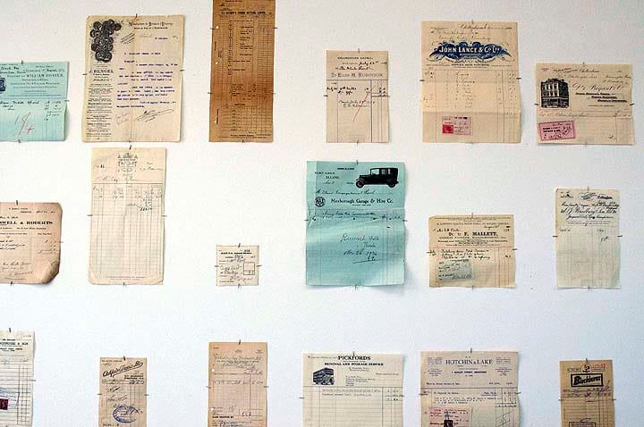 The right wall is plastered with invoices from Britain, France and Germany for such goods and services as Removal & Storage, Groceries, Shoe Cream, Builders & Decorators, Fresh & Refrigerated, Fish Transport, and so on. These bills are sensually rich, made of colored papers of different weights, ruled in all sorts of ways with varied fonts and stamps. They range from eccentric, calligraphic handwriting to modern computerized digits; many of the early invoices depict etched logos, insignia, and delicate hatched line drawings scrawled with colored pencil, marker and pen. There are a few blank spaces on the walls indicating missing invoices, particularly around 1972, 73, and 75. One letterhead from the Sue Ryder Home for the Sick and Disabled in 1992 reads, “My husband bore his suffering courageously and nursing him was a great privilege.”