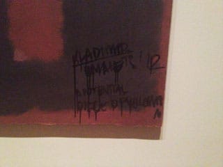 The major problem for conservators is that Umanets didn’t actually attack the canvas with a paint marker, as it seemed from photographs. His inscription (his name, plus the phrase “A potential piece of yellowism”) was actually made with a graffiti-style ink pen, and the ink has bled “all the way through the canvas,” the BBC reports. Conservators will have to dig through Rothko’s famously complex layers of materials, which include glue, synthetic resin, and egg, to remove the ink, then rebuild it after cleaning.