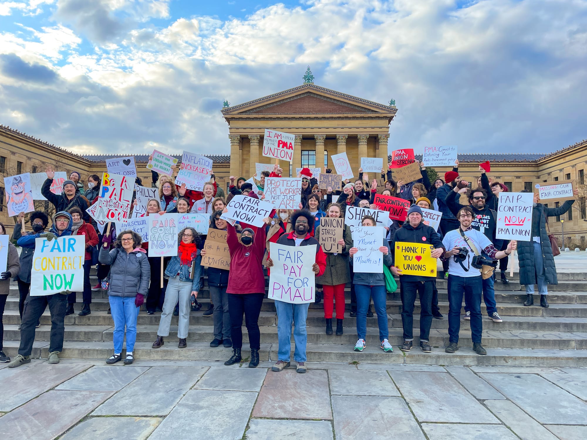 A group of about 250 PMA employees, AFSCME members, and Philadelphia neighbors listened and clapped along with speeches from museum staff, union representatives, Philadelphia muralist Symone Salib, and politicians including Pennsylvania State Senator Nikhil Saval. AFSCME members led rounds of hearty chanting, such as “What do we want? A contract! When do we want it? Now!” and “Get up! Get down! Philly is a union town!” Participants waved signs featuring slogans like, “FAIR CONTRACT NOW,” “Put your Monet where your mouth is,” and “The Union Makes Us Strong” while marching around the museum building and up its grand steps, where the energized chanting continued.