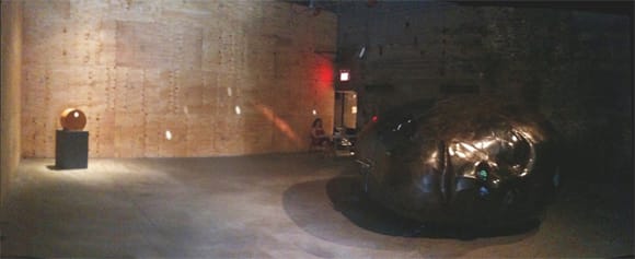 I’d never heard of the New York-based Gregory Barsamian but now I’ll definitely notice his name. His kinetic sculpture “Artifact” (2010) is the main attraction in his solo show at Pierogi’s industrial Boiler space, and it was originally commissioned by the very odd — in that millionaire-opens-contemporary-art-museum kinda way — Museum of Old and New (MONA) in Hobart, Tasmania. The resulting work is a head that seems to have toppled from some monumental ancient sculpture and landed in Williamsburg. The metal sculpture is lit from inside and light spills out of the carefully placed crevices and holes on the exterior.