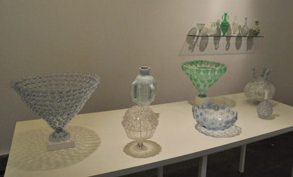 You’ve got two days left to see the Translations in the Ubiquitous Largesse show with Paul Baumann and Shari Mendelson at Sideshow Gallery, so you better run. While the whole show is intriguing, Mendelson — as always — stands out. She has taken plastic refuse (mostly disposable bottle parts from what I can tell) and created rather intricate objects that resemble Roman, Byzantine or early Islamic glass or rock crystal vessels. But beyond what could be construed as an environmental gimmick, Mendelson’s objects don’t only provide eco-commentary but feel more attuned to a futurist sensibility that is not weighed down by doom and gloom.
