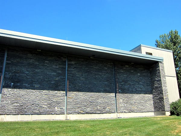 We started at the Granary, which is actually just over the state border in Sharon, Connecticut. Ryan Frank, its Collection Director and Director of Education, led the tour of the private gallery space which houses and exhibits the extensive collections of Melva Bucksbaum and Raymond Learsy. The modern, materials-based exterior would have made Bruce Goff proud, but the interior is as pristinely placeless as any Chelsea gallery. (No pictures were allowed within — BOOO! — your imagination will be required below.) Designed by Steven Learner Studio, the L-shape building has several large and small exhibition spaces, with strategic windows diffusing natural light in through the granite and cedar-lined exterior walls.