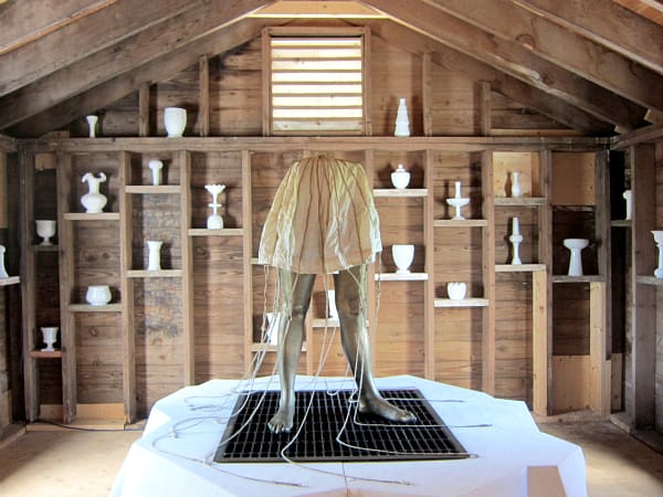 The rest of the mill’s many stories (I think I counted seven, but I was out of breath at the top and perhaps delirious), is given over to the 2011 Summer Exhibition that is held in conjunction with the Wassaic Project Summer Art Festival. You can really lose yourself climbing up into the reaches of the mill, stumbling upon a labyrinth made of men’s dress shirts or spying an illuminated bird cage in a dark chasm. Rather than the incomplete feeling I often get at eclectic group shows, I really enjoyed not knowing what to expect in each room and welcomed disorientation.