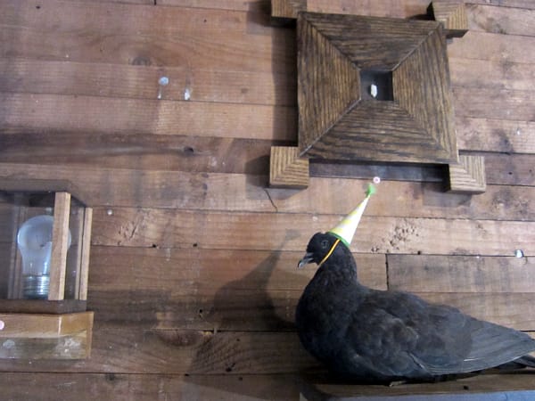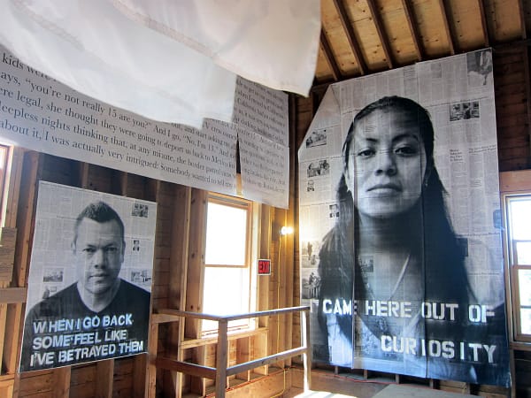 Ascending up more and more stairs, I encountered installations that skillfully used the natural framing of the mill. Ryan Frank, of the Granary and Ode Hotel, had installed in a staircase a segmented lightbox of a transporting cliff vista. As I’m easily won over by wunderkammers, I was instantly drawn to Jackie Mock’s “The Reliquarium,” which included a cabinet of dirt from all 50 states, a piece of the headstone of the wandering mummy Elmer McCurdy (read his insane post-mortem adventures if you are unfamiliar), and a pigeon found in Greenwich Village, inexplicably wearing a birthday hat. I aspire to have such a collection. Further up the tower, “What Moves You?,” a collaborative project that addresses global issues, had a striking installation on immigration.