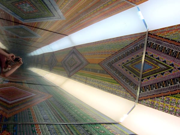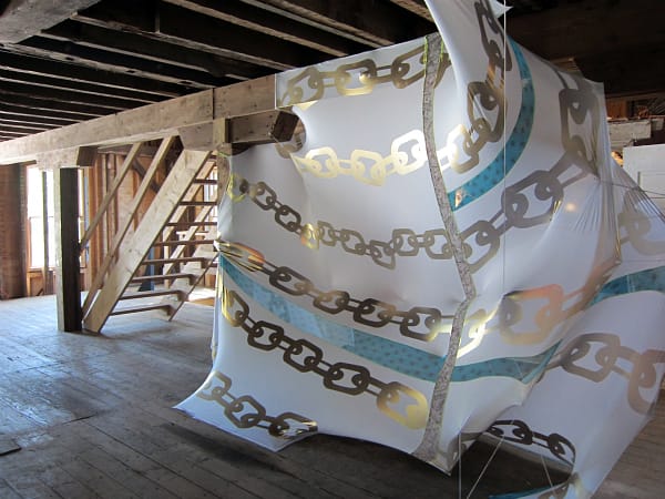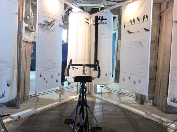 Before climbing the heights of the mill, I got some early vertigo from Ghost of a Dream’s “Remember When Tomorrow Came,” a chamber where mirrors make up the ceiling and floor and used lottery tickets pattern the walls. Although it wasn’t working at the time, I would have loved to ride Sera Clara Creston’s “The Knowhere Machine,” a bike that rotated drawn landscapes in a pulley system.