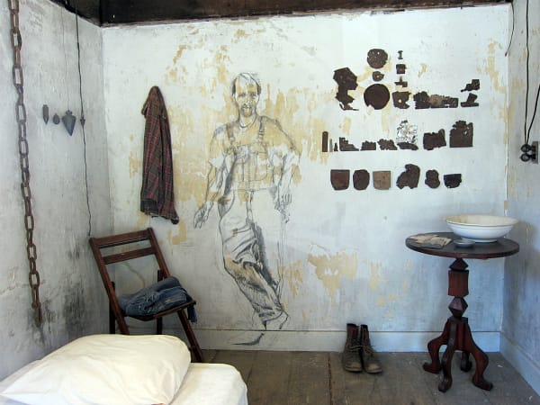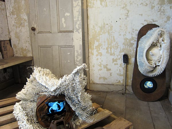 Moira Kelly has drawn ghostly men that might have once been hotel guests on her room’s walls, and invites visitors to touch the old possessions that naturally inhabit the room. Hairy flowers by Michael Galvin and winding cardboard fans by Ian Trask haunt the ceiling and Tracy Walter-Ferry installed alien creatures that seem to have grown from a shipwreck in a coral reef.