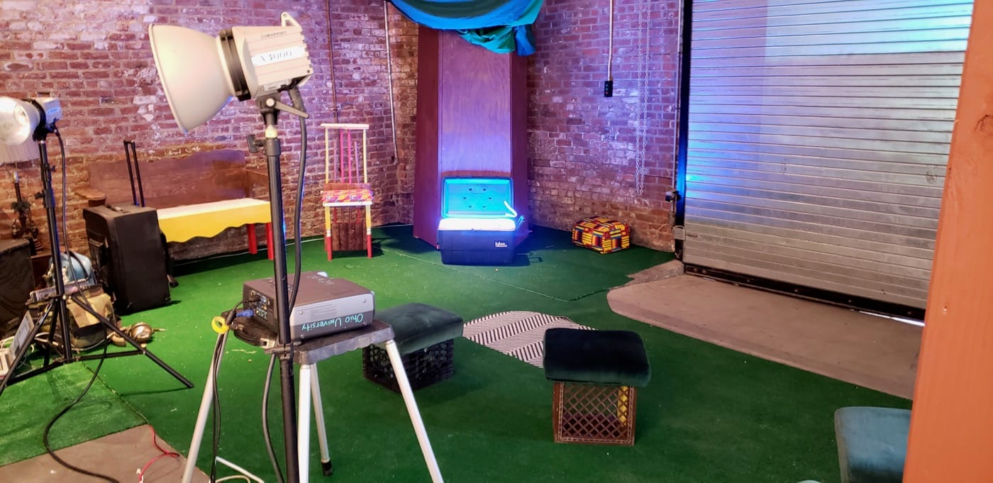 My experience of the 1-54 contemporary African art fair mostly consists of being awed by all the beauty contained within that (relatively) small building in Red Hook. Stopping in at the first space I encounter I see Azikiwe Mohammed working on elaborating his design of the lounge, which he conceived as a kind of extension of his New Davonhaime project, the name of which is a linguistic amalgam of the names of the five US cities with the highest concentration of African Americans. As indicated by the adjacent wall text, the essence of his lounge project is, similar to Davonhaime, to create a “town-cum-safe space.” But in addition to the features one might expect at an artist’s lounge — chairs, cushions, tapestries, audio speakers — there is also a cooler with its lid open emitting light from its inside like some urban holy grail.