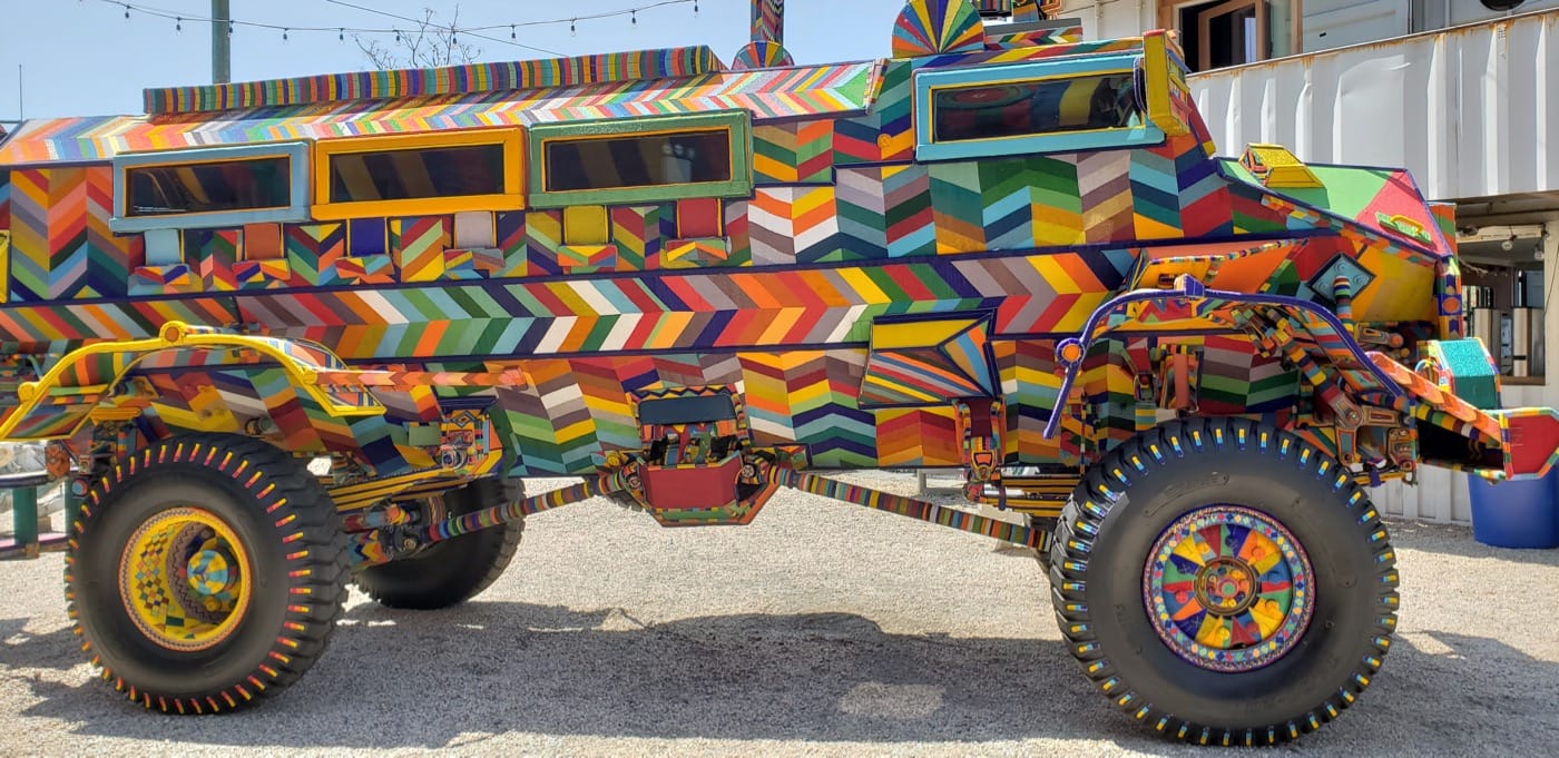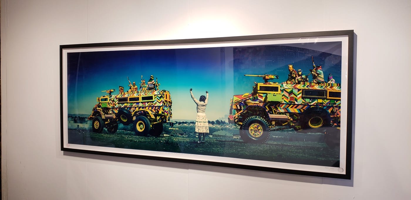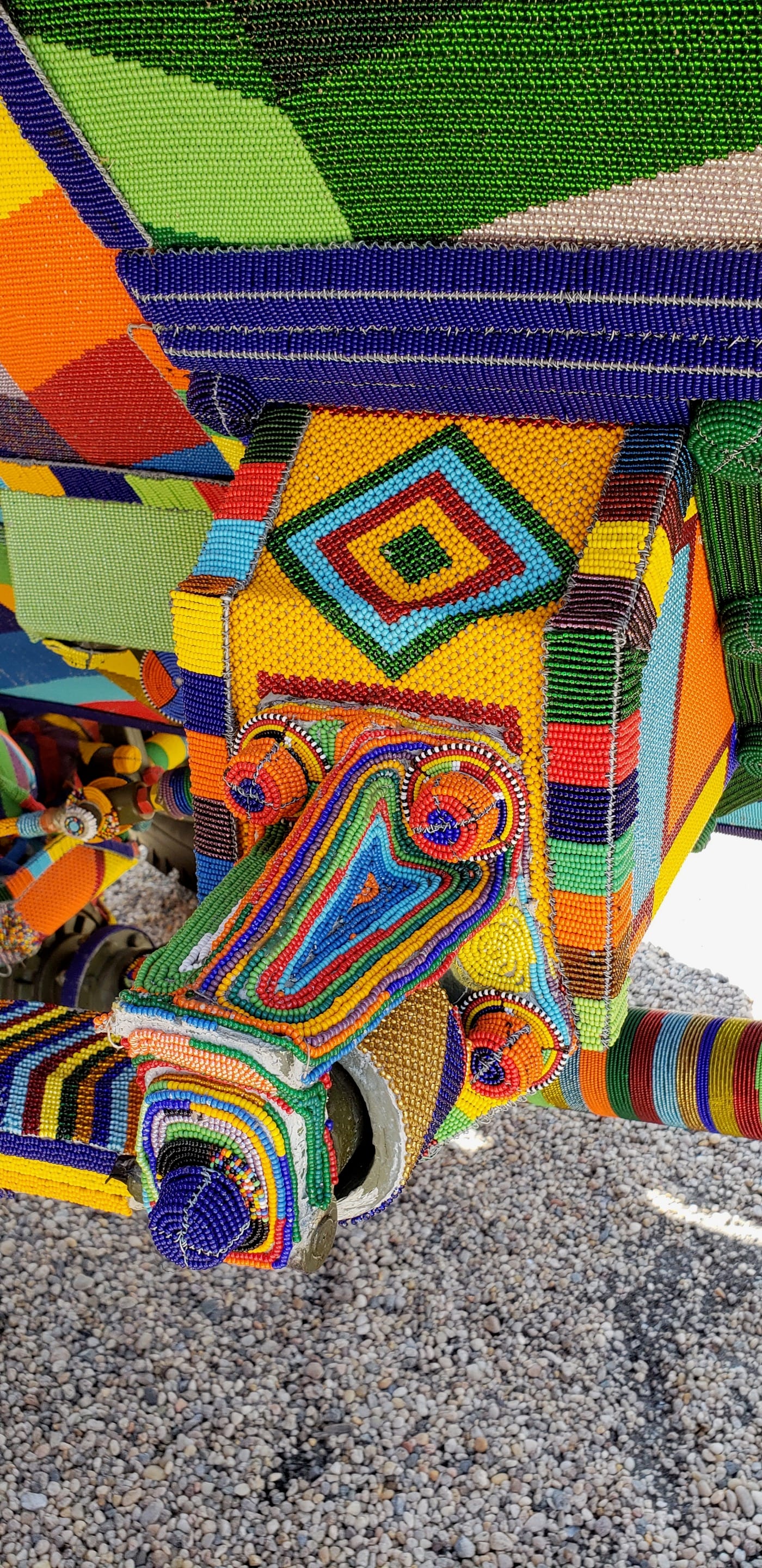 Throughout my time here I find myself falling into the narratives behind each of the compelling installations I saw. I want to spend more time listening to the gallerists and taking notes so that I can faithfully describe the work to others. For example, behind the work of Ralph Ziman is his story of being born and raised in Johannesburg, South Africa and developing a deep concern for the tools and technologies of state-sponsored violence, which he witnessed being savagely enacted on the black population under Apartheid. His gallery Sulger-Buel Lovell has images of a Casspir military vehicle Ziman acquired and repurposed by engaging artisans from Zimbabwe and the Mpumalanga province of South Africa to cover over its entire surface with panels of vivid glass beadwork, which are arrayed in traditional patterns. Ziman’s idea seems to be to turn a war machine into decorative, decidedly non-utilitarian object, thus negating its power to psychologically and physically dominate. Amazingly, the entire vehicle was transported over and is set up in the outside garden space.