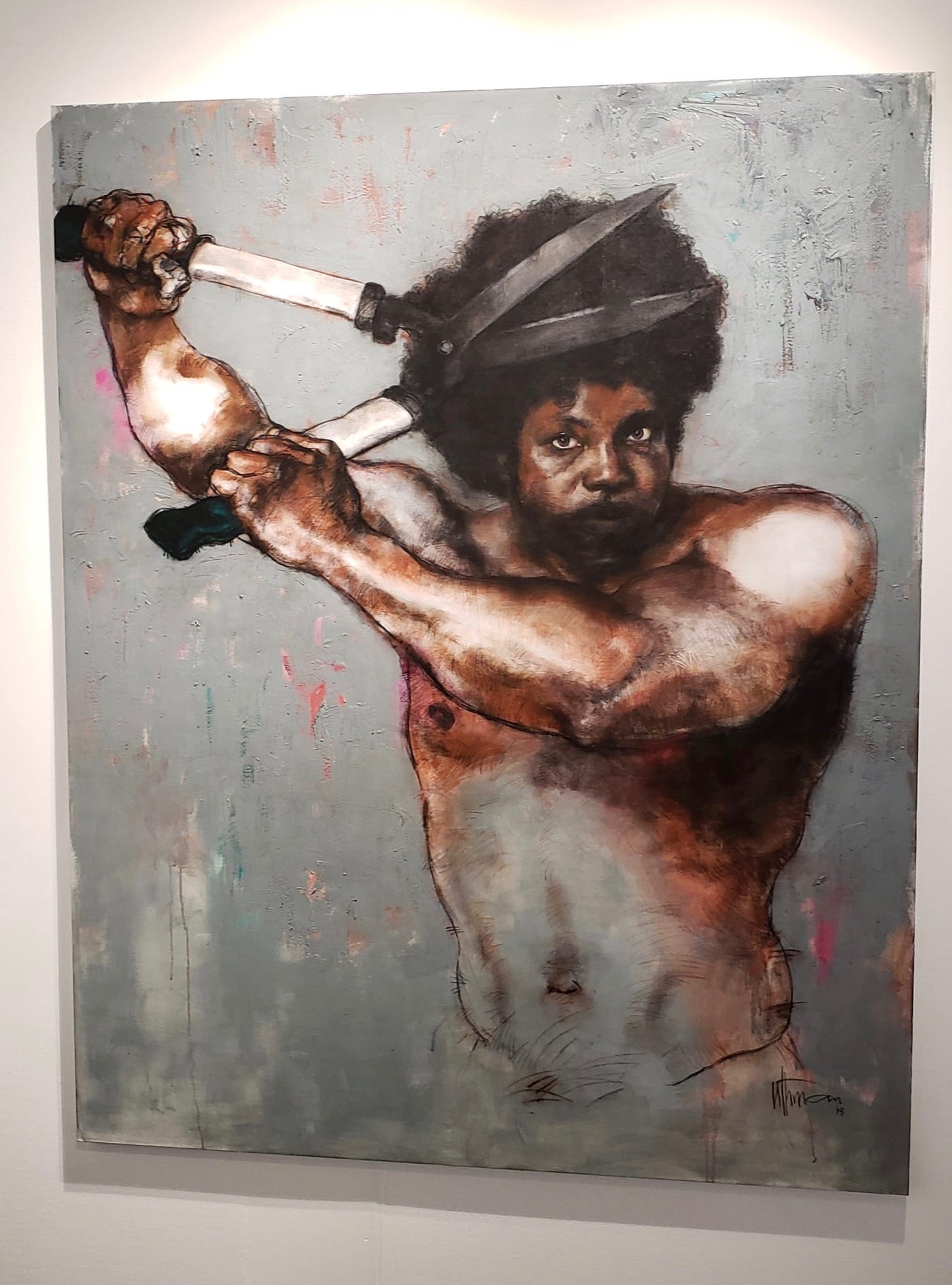 Many of the exhibiting galleries are from the continent — Cote d’Ivoire, Ghana, Nigeria, South Africa, and Tunisia — with a few also from Europe, but I found wonderful work at a space based here in New York. Sapar Contemporary is showing Uthman Wahaab from Nigeria, who makes work about the incompatibility of technological tools for the tasks to which they are applied. His 2018 piece “Revamping Shears I (Hybrid Theory Series)” illustrates this well with its image of a black man attempting to cut his own overgrown afro with gardening shears.