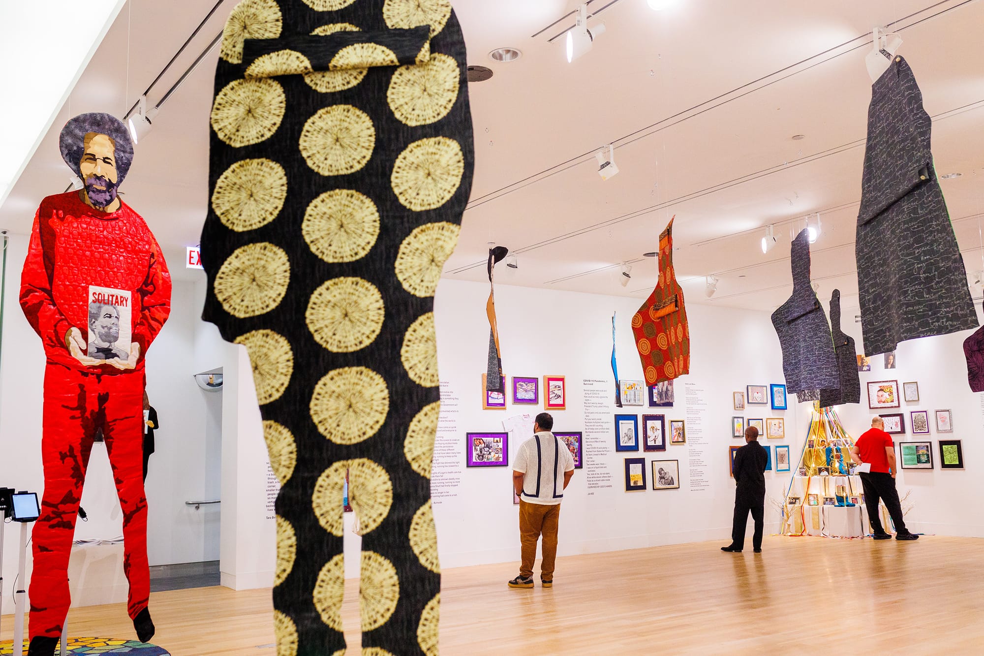 The COVID-19 pandemic threw structural injustices into stark relief in countless contexts across the country, but the experiences of incarcerated people provided some of the most devastating evidence that our system does not value all lives equally. Social distancing was impossible in overcrowded facilities and personal protective gear was rarely available, resulting in rampant infection. Michelle Daniel Jones — a scholar, activist, and artist focused on the carceral system who campaigned in Indiana for the emergency release of sick and elderly inmates, as well as those serving brief sentences — has gathered 61 works by 50 presently or formerly incarcerated artists who created art about or during the pandemic. Hanging from the ceiling are compelling quilted portraits of incarcerated survivors of police violence by artist and “quiltivist” Dorothy Burge, as well as textile memorials to Albert Woodfox, who endured more than four decades of solitary confinement and torture, and two Black trans women killed in Chicago last year.