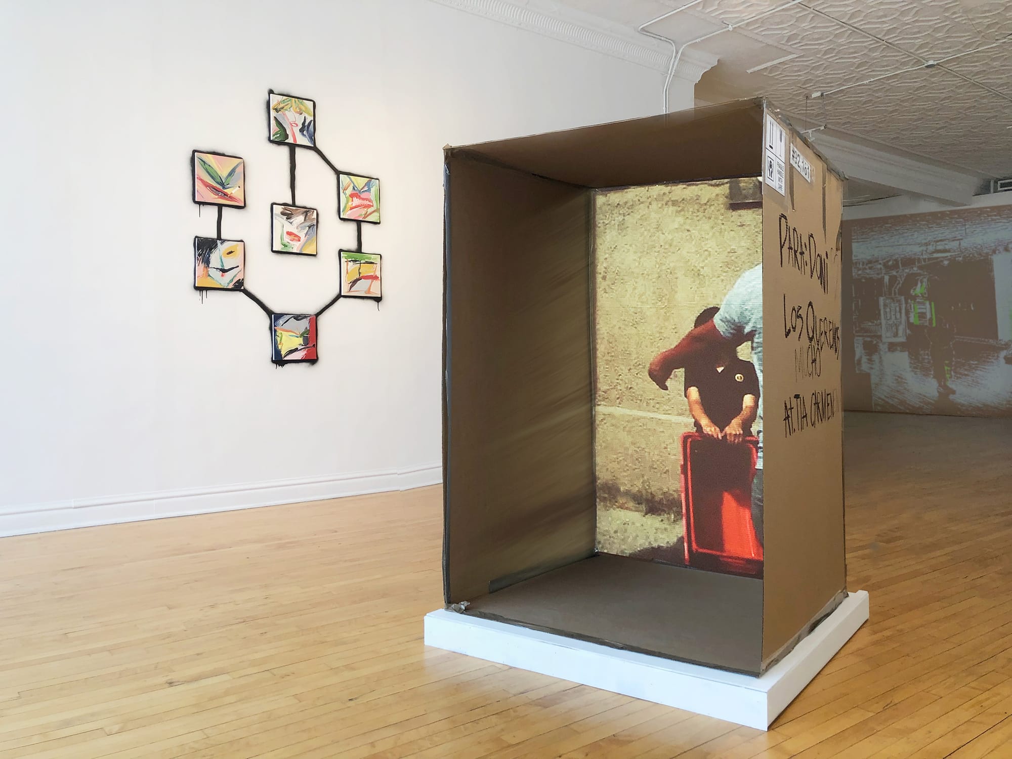 Installation view of Marjorie Matamoros, “Olor a Estados Unidos/Smells like the US” (2023) single channel projection and cardboard, 60 x 41 x 41 inches (photo by and courtesy Public Works)