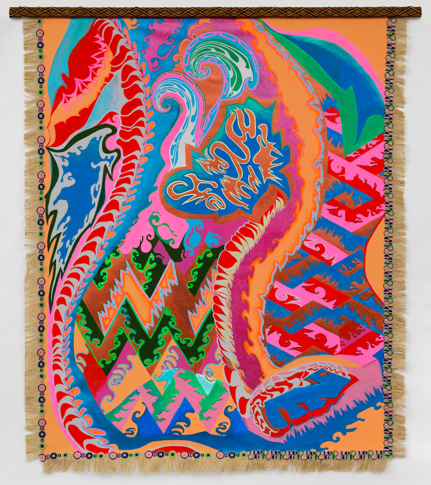 Chicago-based artist Lisa Alvarado draws on a wide spectrum of visual traditions to realize the potential of abstraction to engage with memory, geography, and the political. Her work is informed by Native American textiles, Chicano Muralism, her own border identity, and her musical practice as part of the band Natural Information Society. Pulse Meridian Foliation reflects this sense of creative hybridity, featuring double-sided paintings, a new mural, photography, and sound installation.