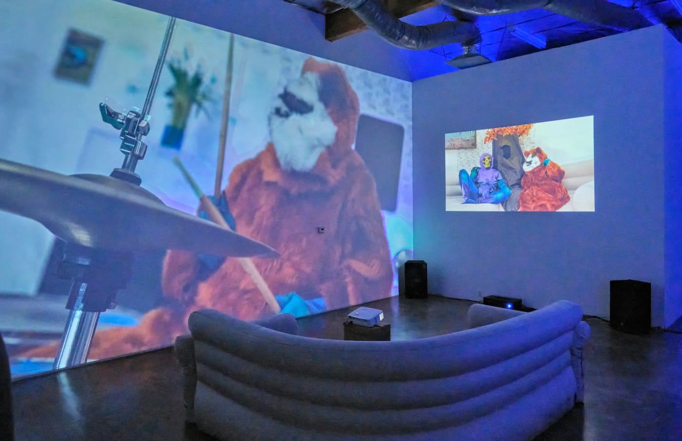 A Bear Shits in the Woods is a low-rent phantasmagoria created by London-born, LA-based artist Olivia Mole. Through installation, performance, sculpture, drawing, and video, we follow three characters pulled from her stable of schlock and pop-culture heroes: A bear, similar to the toilet-paper shilling Charmin mascot; Skeletor, or Skelly, the villain in ’80s cartoon He-Man; and a tree, or rather, a person dressed in a dime-store tree costume. Set in a cabin in the woods, the trio goofs off, plays the drums, and melds into one another as a strip tease reveals costumes within costumes. From common archetypes, Mole crafts something fresh and undefinable.