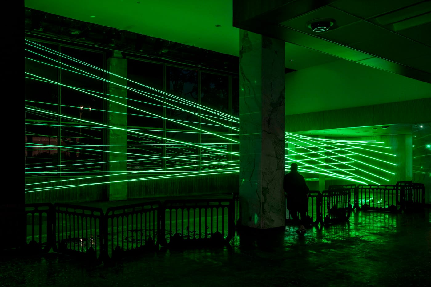 Last month, the Hammer Museum unveiled its long-awaited transformation, two decades in the making. To inaugurate its newest gallery, a former bank vault, it has mounted a presentation of Rita McBride's Particulates, a laser light installation first exhibited in 2016. High-intensity laser beams interact with water and dust in the air, forming a hyperbolic parabola stretching across the width of the space. The work can be seen both night and day, visible to passersby on the street after museum hours through tinted windows.