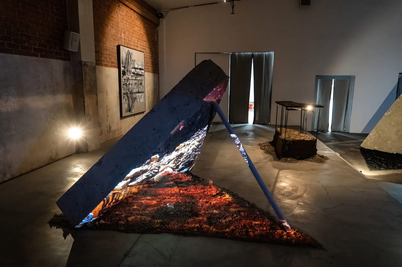 Environmental artist Lauren Bon and her Metabolic Studio are involved in exploring the landscapes under LA's asphalt and concrete, the city's ecological infrastructure. Projects range from transforming a former industrial site into a 32-acre cornfield, to a 240-mile performance leading to the source of the waters that feed the Los Angeles Aqueduct. The studio's current project, Bending the River, provides a model for liberating the LA River from its concrete channelization, beginning with dispersing a small amount of water to several public parks, representing the river's original floodplain. Underland showcases the Studio's work on this project, featuring three triangular sections of the LA river floor that were removed in 2021, repurposed here as screens on which to view evocative and documentary material.