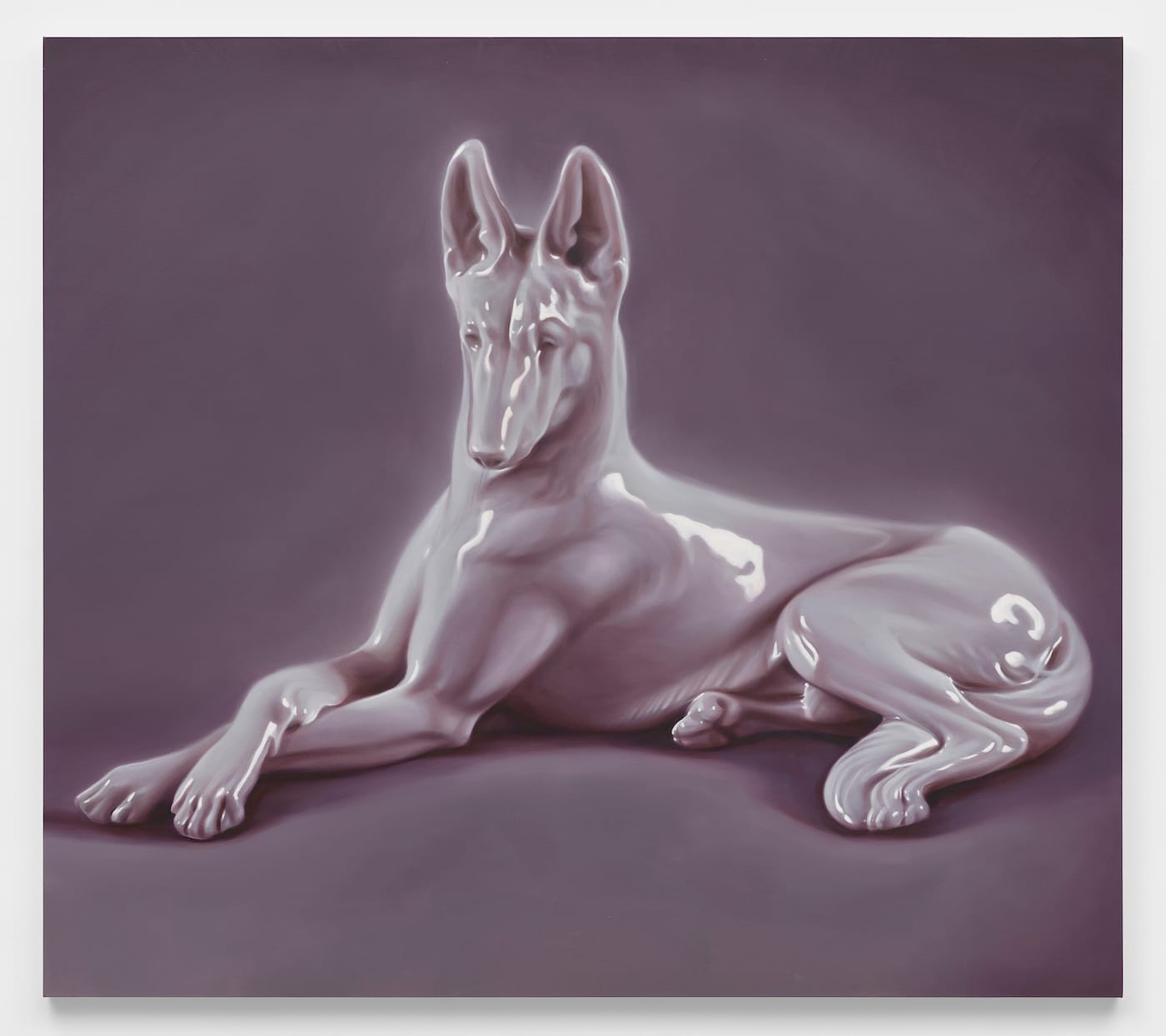 Behind the seductive surfaces of Robert Russell's paintings of kitschy porcelain figurines lies a sinister history. The ceramic dogs, bunnies, and sheep he depicts are based on wares produced by the Allach Porcelain Manufacturing Company, a German factory founded in 1935. As German labor became scarce during World War II, they moved production to the Dachau concentration camp, where prisoners were forced to create these objects that represented the purity of Aryan culture. Russell enlarges these once delicate works to a monumental scale, highlighting the link between the banal and the evil.