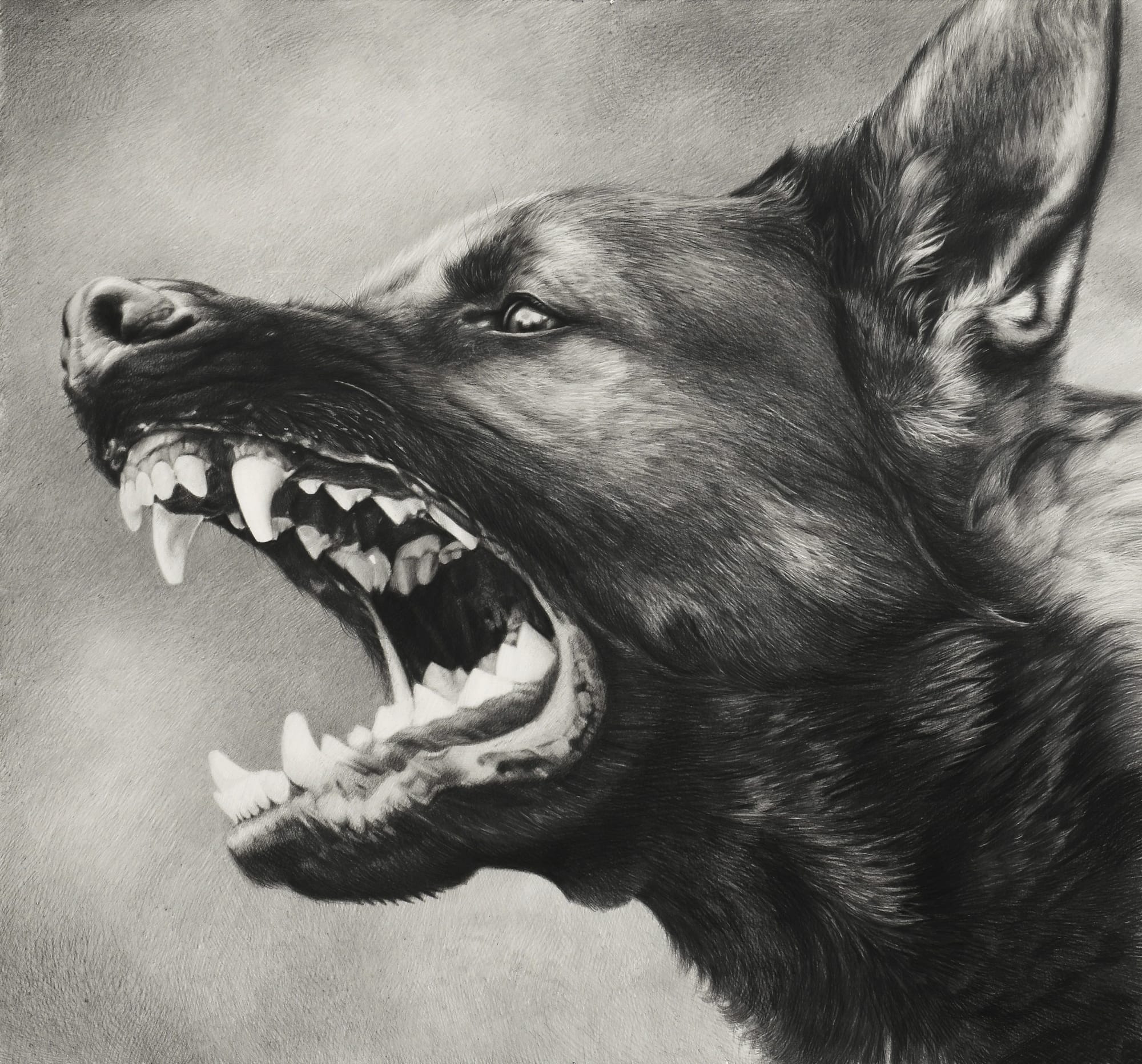 Dogs & Dads is a three-artist exhibition that explores themes of rage, family, patriarchy, and companionship through images of canines and fathers. Karl Haendel’s photorealistic pencil-on-paper works such as "Angry Dog 6" (2023) meticulously capture the open maws and sharp fangs of snarling beasts, conveying a duality of protection and aggression. Taylor Marie Prendergast’s hazy, black-and-white paintings and drawings depict dogs with a melancholic gravitas and inscrutable psychological intensity. Meanwhile, David Sipress’s cartoons, originally published in publications like The New Yorker, provide wry comedic commentary on the challenges of existing with other beings in the world.