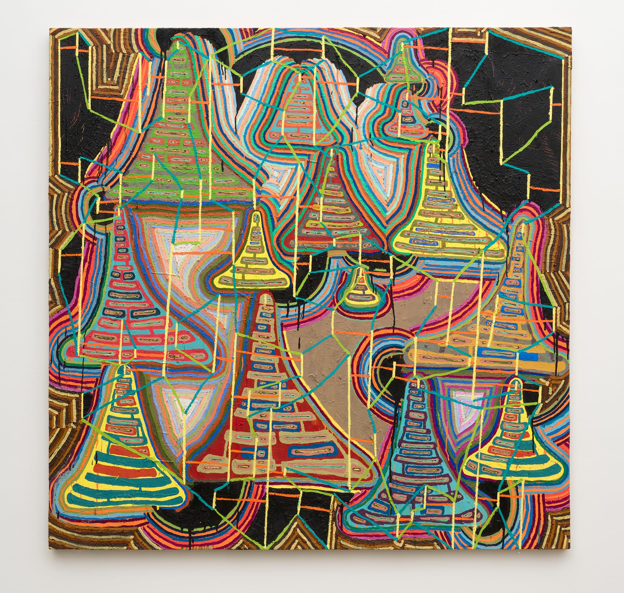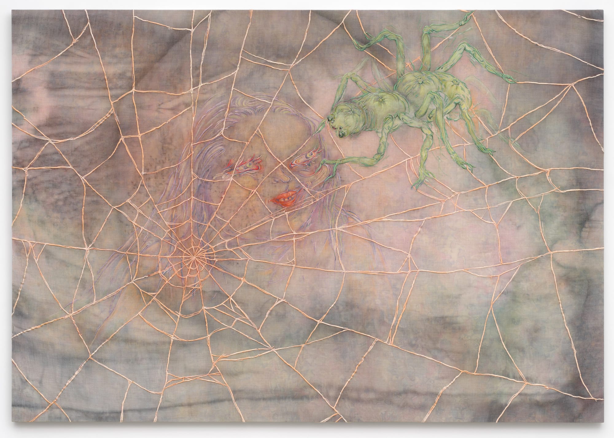 Lila de Magalhaes’s dyed and embroidered works depict fantastical rococo dreamscapes of interspecies entanglements against the erotic backdrop of bedsheets. In “The Eden Project” (2024), a woman canoodles with a worm, while “Pleasure Dome” (2024) features an insectoid orgy atop a mound of steaming excrement. Sewn threads define forms against a fluid backdrop of vibrant color washes, conveying the messy metamorphosis of the show’s title.
