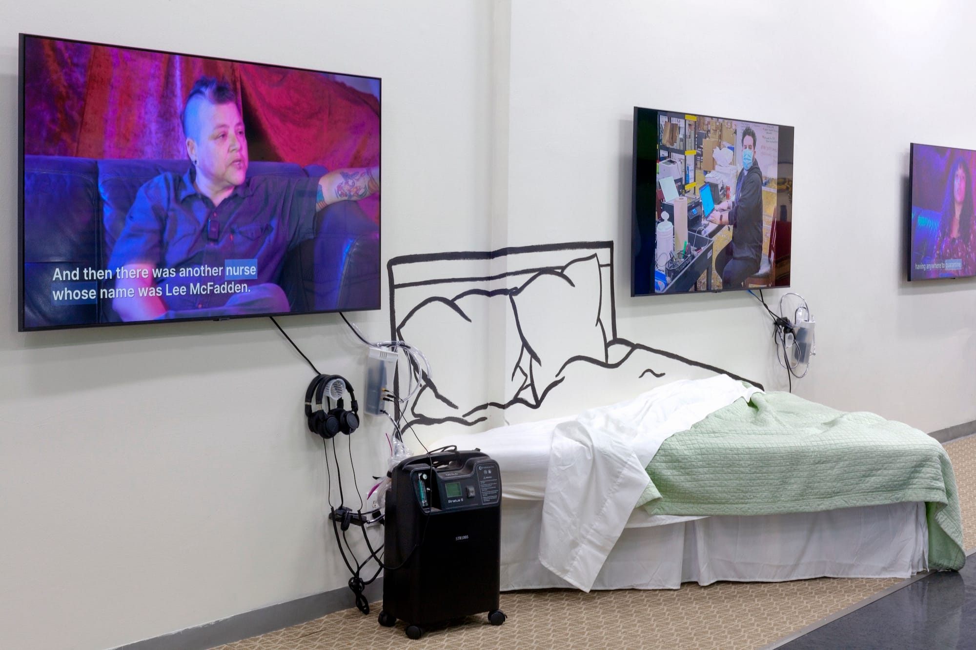 Welcome to the Covid Hotel is a multi-disciplinary exhibition that pays tribute to the Los Angeles County Department of Health workers who set up emergency Quarantine and Isolation (QI) sites for houseless Covid patients in vacant hotels and motels in Spring 2020. They ultimately served over 10,000 people, losing a remarkably low number of people to the disease, and were able to secure shelter for 93% of the patients who needed housing after treatment. The workers tell their accounts in their own words through video recordings mounted within a recreation of a motel QI site, offering a glimpse into their life-saving endeavors.