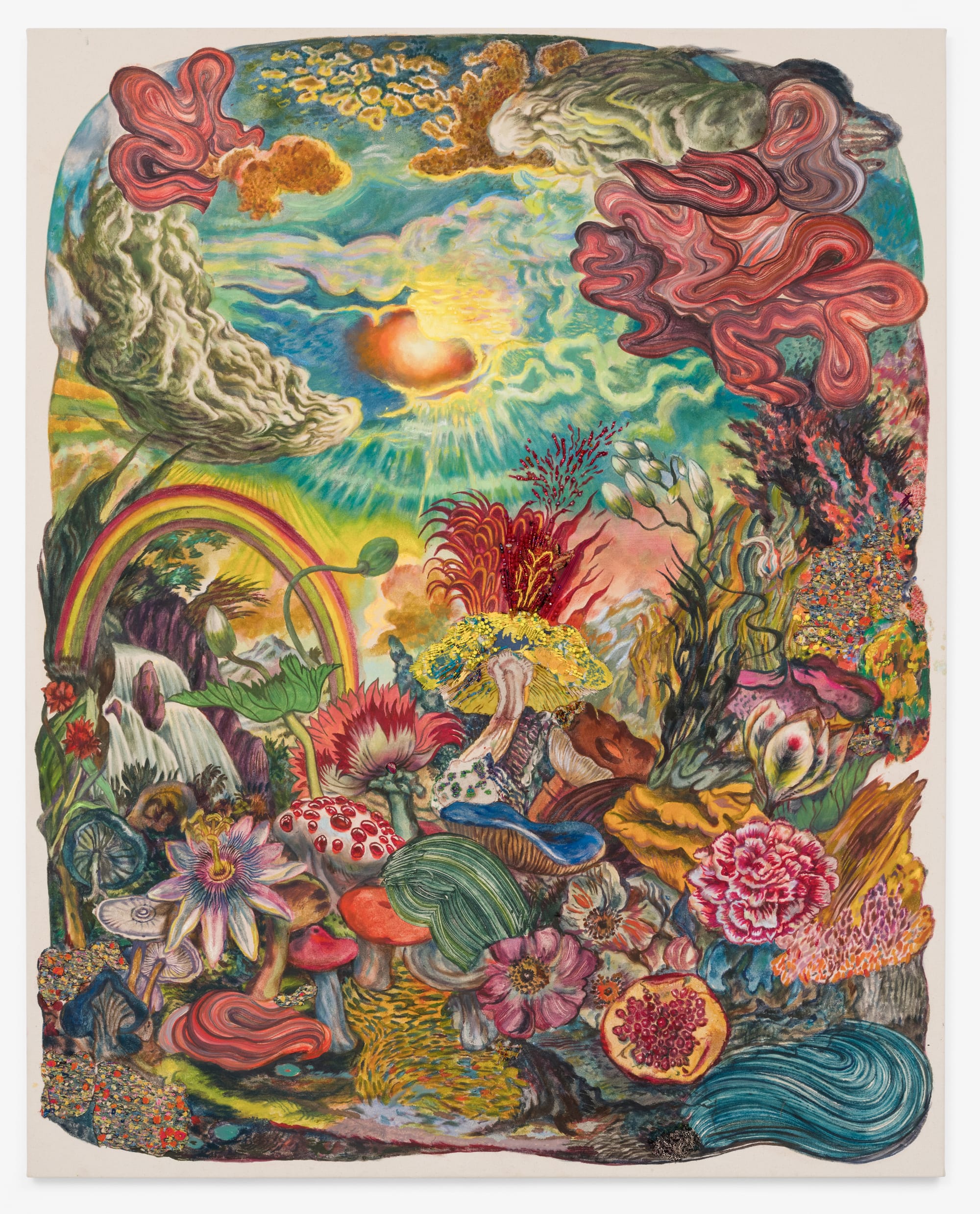 Ken Gun Min’s fantastical paintings draw from both European and Asian styles and techniques, a fusion that reflects his own global journeys. Born in Seoul, South Korea, Min lived in Zurich, Berlin, and San Francisco, before moving to Los Angeles’ Koreatown a decade ago. He incorporates Korean pigments and hand embroidery into traditional oil paintings, whose verdant landscapes and idealized bodies reflect precedents from the European Renaissance and Romanticism to Asian textiles and landscape painting. However, his works are firmly rooted in the here and now of contemporary Los Angeles, with titles referencing local neighborhoods, and featuring diverse depictions of Asian masculinity not often seen in mainstream art and culture.