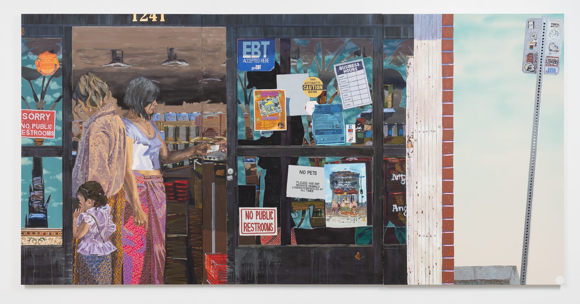 Tidawhitney Lek’s captivating canvases depict the people, streets, and spaces of Cambodia Town in Long Beach, including personal scenes of her own family life. Filled with everyday details that ground each painting in time and place, Lek adds elements of surreality and horror that shatter the impression of placidity, recalling the traumas of war and migration that so many diasporic communities carry with them.