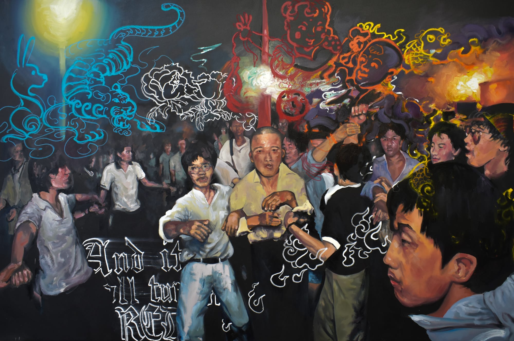 Larry Li’s paintings combine images taken from family snapshots and historical archives, overlaid with Chinese cultural symbols, to convey a disjointed narrative of memory and trauma. Ask Your Ma About ’89 confronts the Tiananmen Square Massacre, and the artist’s attempts to piece together his family’s involvement in the pivotal and tragic event. Informed by multiple recollections, and filtered through the challenges of language and time, Li presents a multifaceted, layered composite of this historic moment.