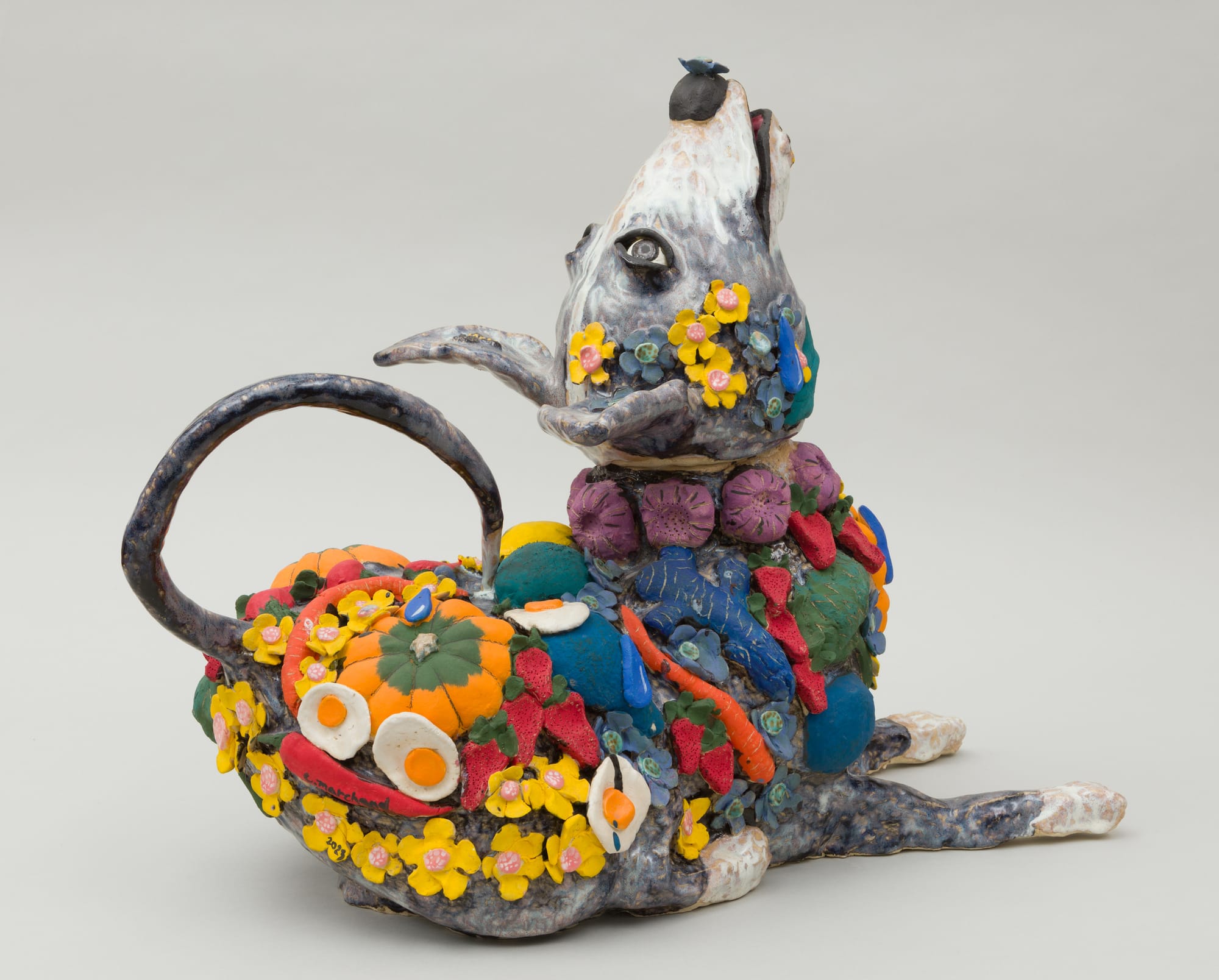 During the COVID-19 pandemic, Emily Marchand dealt with the isolation and grief of lockdown by focusing on two things that represented hope and connection: her garden and her dog, Ozzy. The Slumber of a Prince is replete with life-size ceramic sculptures of Ozzy in various states of joy and repose, his body covered in a cornucopia of colorful flowers, plants, and fried eggs. Accompanying glazed-tile wallworks depict canine forms floating through verdant vistas of flora and fauna. Created before Ozzy’s death last summer, these anticipatory memorials, though tinged with the pain of loss, celebrate a life well lived.