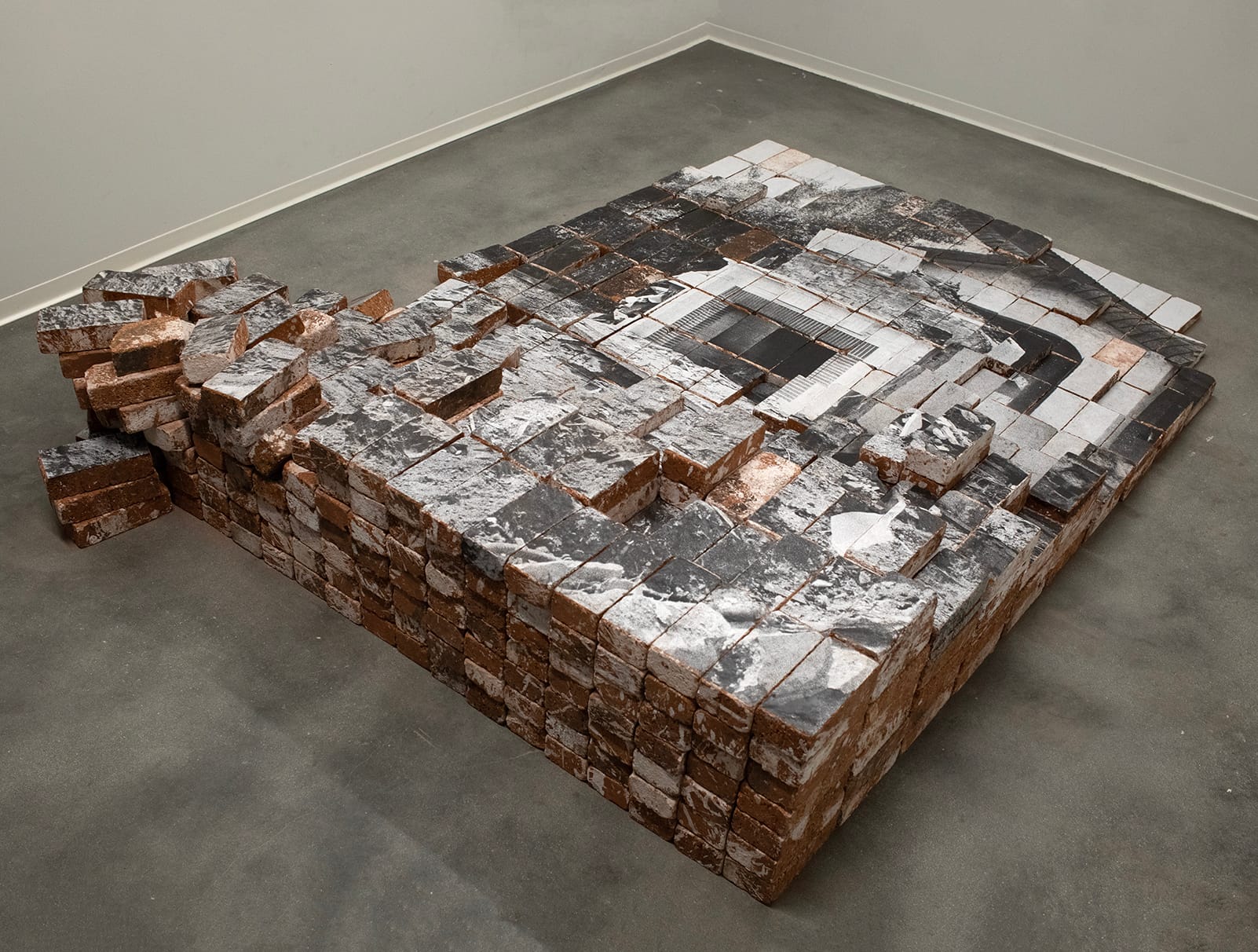 Los Angeles is a town that is constantly being reinvented, both through the migration of people and the disruption and development of the urban fabric. Jackie Castillo’s sculptures reference the physical transformation of the city to call attention to the effect it has on its residents. Turning features stacks on building materials such as bricks and tiles, onto which have been affixed sliced-up images of residential architecture. These stacks resemble both mounds of debris and building foundations, their ambiguous status tied to the beholder's perspective.