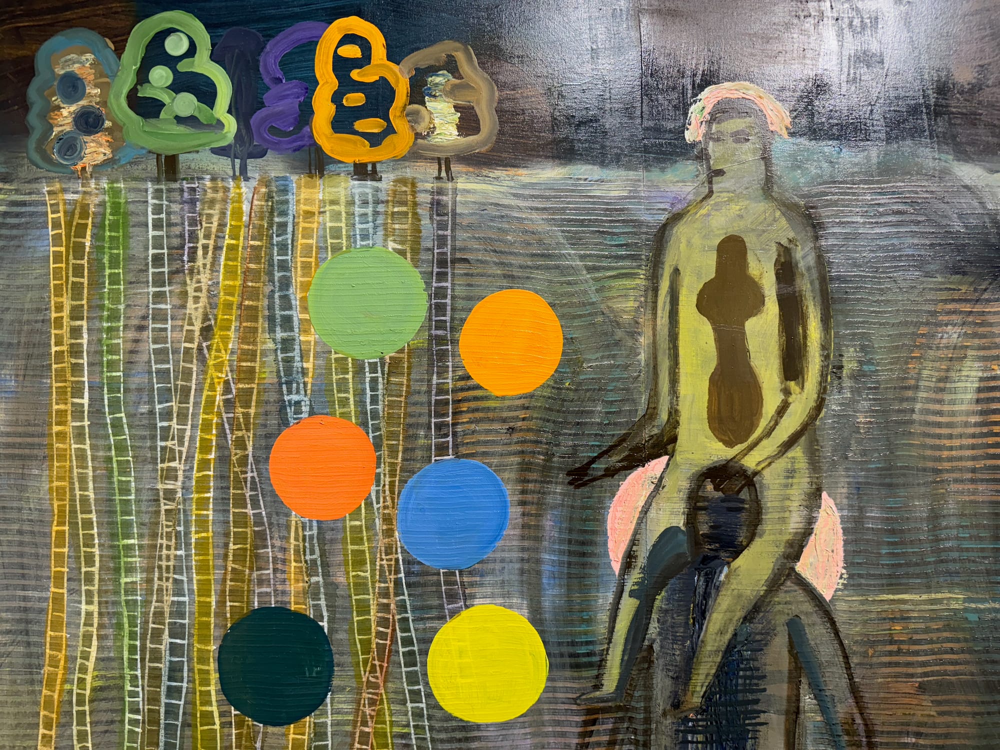 This newish gallery is the site of a solo exhibition by one of the original members of the influential Godzilla: Asian American Arts Network, Charles Yuen. His brash, textured canvas works have a dreamlike quality that distills seemingly simple compositions into layered scenes that occupy your imagination. “Shoulder Assist” (2023) and “This Again” (2023) are good examples of his language cutting to the core of what almost feels like various artistic anxieties. In the former, a figure sits atop another’s shoulders as they stare at a forest of ladders and dots that form the roots of a gesturally outlined forest, and in the other, a figure catches fire while their companion appears helpless to do much of anything with its ladder arms. Paint often seems to be in flux on his surfaces and the artist refuses purity in favor of a sometimes muddy line that produces a sense of speed, as if the artist was jotting something down before the idea slipped away. —HV
