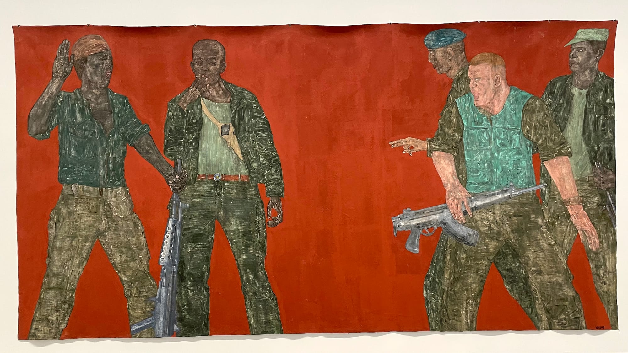 Few words can fully convey the brutality Leon Golub’s paintings. On a sociopolitical level, the artist’s visceral images of mercenary soldiers and authority figures reify the power relations that bolster dictatorial regimes. But, like Otto Dix, Kim Jones, and other artists who experienced war and abuses firsthand (Golub served in World War II as an army cartographer), his art aims at the gut more than the mind. Rendered on linen tarps, sometimes using instruments like meat cleavers, works like “Mercenaries IV” (1980) and “White Squad V” (1984) perform intimidation and aggression as they record it. The blood red background in the former is a power move in itself, an assault on vision that at once commands and aggrieves attention. It serves as the stage for the five brute figures dressed in the khaki and green of camouflage, two holding machine guns. Yet a swath of saturated red in the composition's center asserts the color as an equal actor in the scene, one reflected in the red, burned bodies of “Napalm III” (1969).