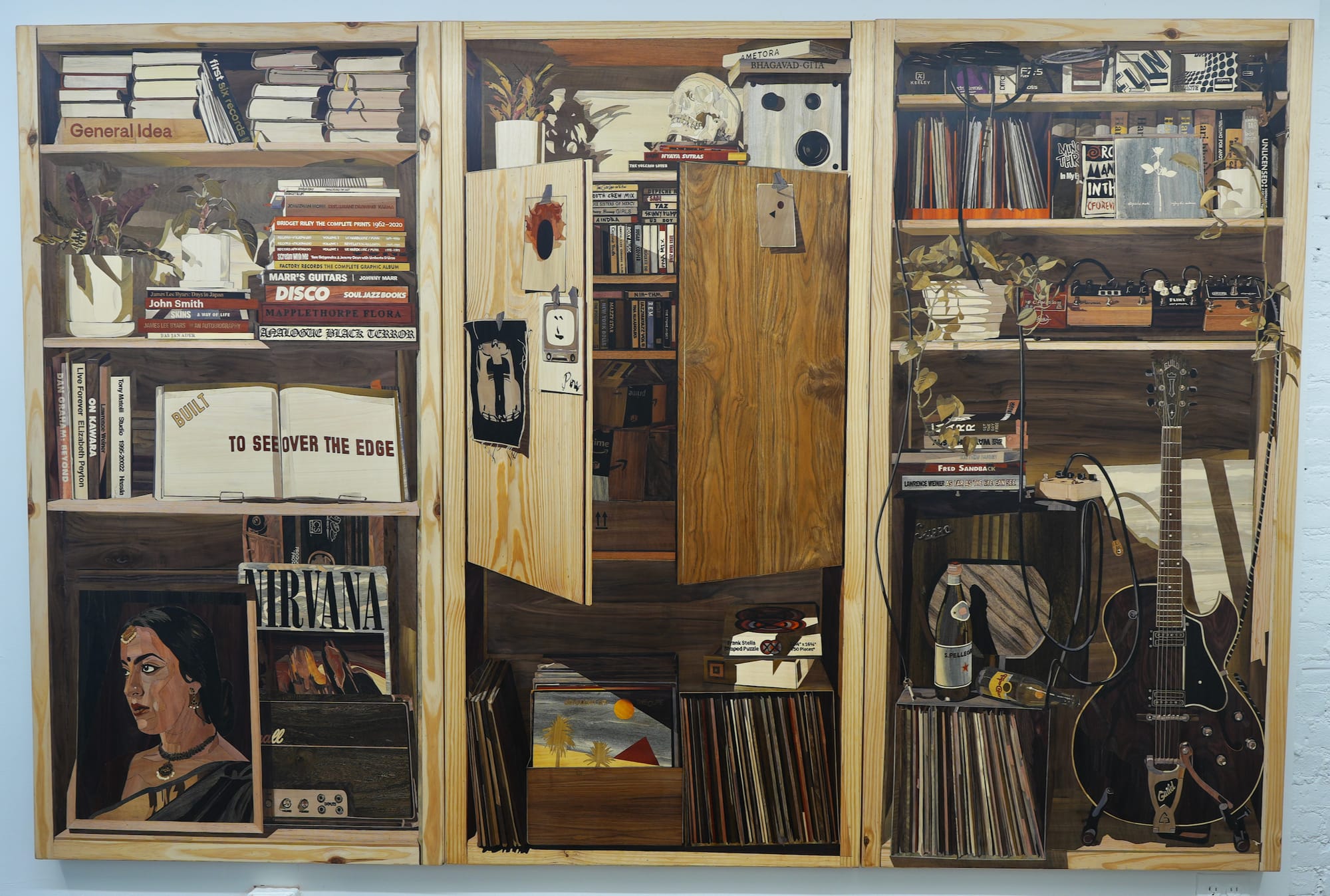 During the pandemic, some of us started baking sourdough or cleaning out our closets (I fall into the latter, while my spouse tried the first), but artist Michael Bühler-Rose took up marquetry, and these four works at New Discretions at Situations (why are gallery names getting worse?) are wondrous examples of what he calls the “collapse [of] my inner life … growing up in both the Hare Krishna movement and the punk/hardcore music scenes.”