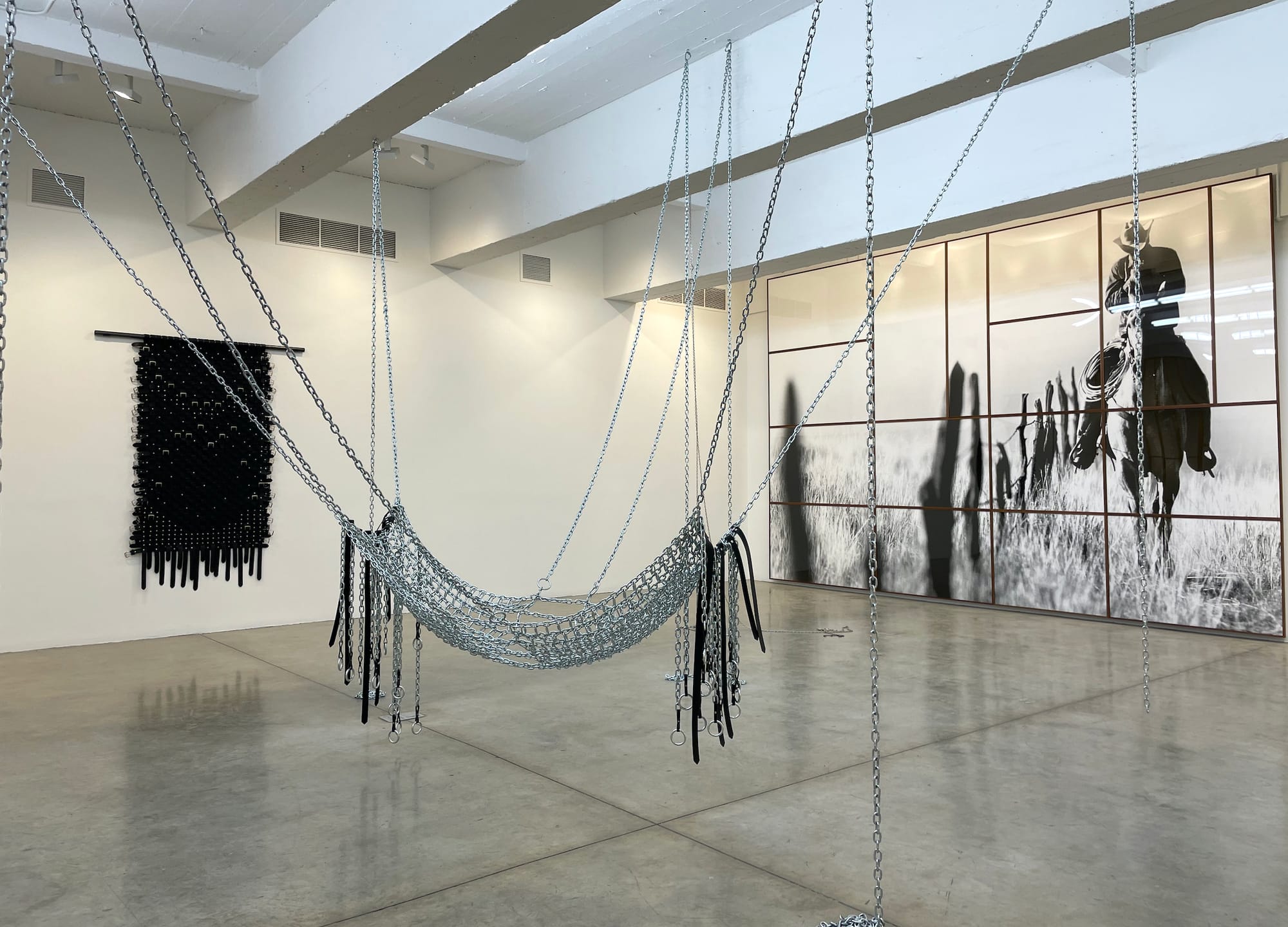 Tanya Bonakdar Gallery has long excelled at presenting conceptual art that is visually and intellectually engaging. This show is both of those, with a dry, bitter sense of humor to boot. A first-floor installation might appear almost clinical at first — all metal chains, fluorescent lights, and slick surfaces — but it hides undercurrents of transgressive desire: the chains terminate in handcuffs, leather belts are woven together, a cluster of objects turns out to be chainsaws coated in black rubber, and glass tongues emerge from holes in pink-tinted mirrors that reflect the entire installation, adding an element of voyeurism. While the artist’s feminist themes aren’t front and center in the show, her sly imprisonment of a giant Marlboro Man cowboy, in a black and white image on one wall, into her bondage fantasy (complete with yellow-painted wood bars enclosing one entrance) refuses the male-centric power relations that dominate BDSM worlds. Although the text-based works on the second floor, bearing phrases like “own your own desire” and the show’s title, aren’t quite as compelling, they give voice to the libidinous energies simmering beneath the show’s surface. —NH