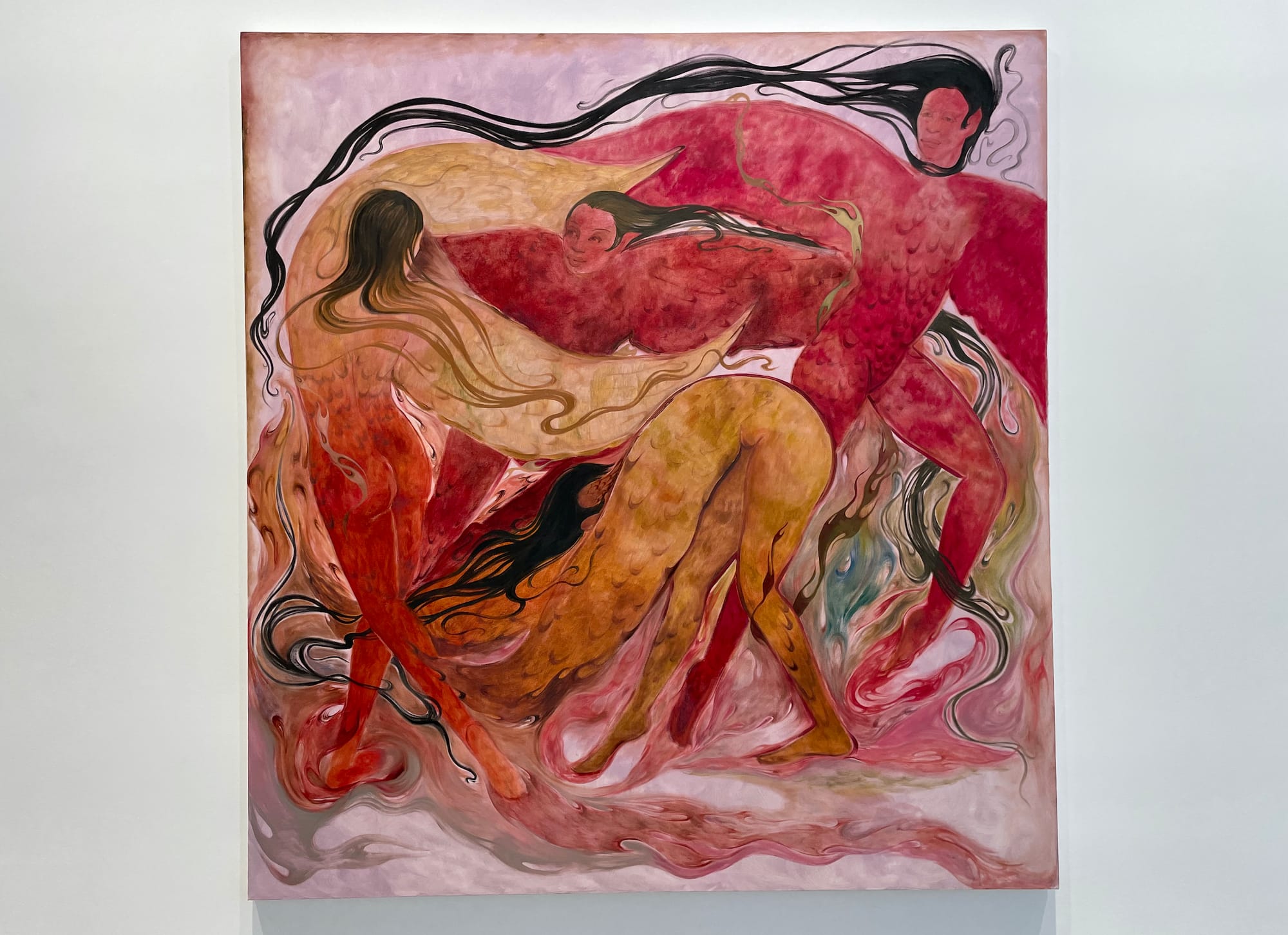 There’s no doubt that Naudline Pierre’s expansive paintings of fantastical femme figures are gorgeous, but what elevates them beyond their surface allure is the melancholy that suffuses them. As sprite-like forms coalesce and recede amid swirls of warm jewel hues, and blend into one another, they appear suspended between individuation and loss of self. In “A Hopeful Many” (2024), faces peer out from gray, cloud-like forms, just barely discernible, while the horizontal figure in “Longing For” (2024), rendered in a fiery orange-red, seems almost one with the Turner-esque storm of flames and clouds that surrounds her. Pierre’s elegant, expressive gestures activate the fluidity of the figures and evoke a realm that is forever in flux. These poignant paintings linger in the imagination long after seeing them. —NH