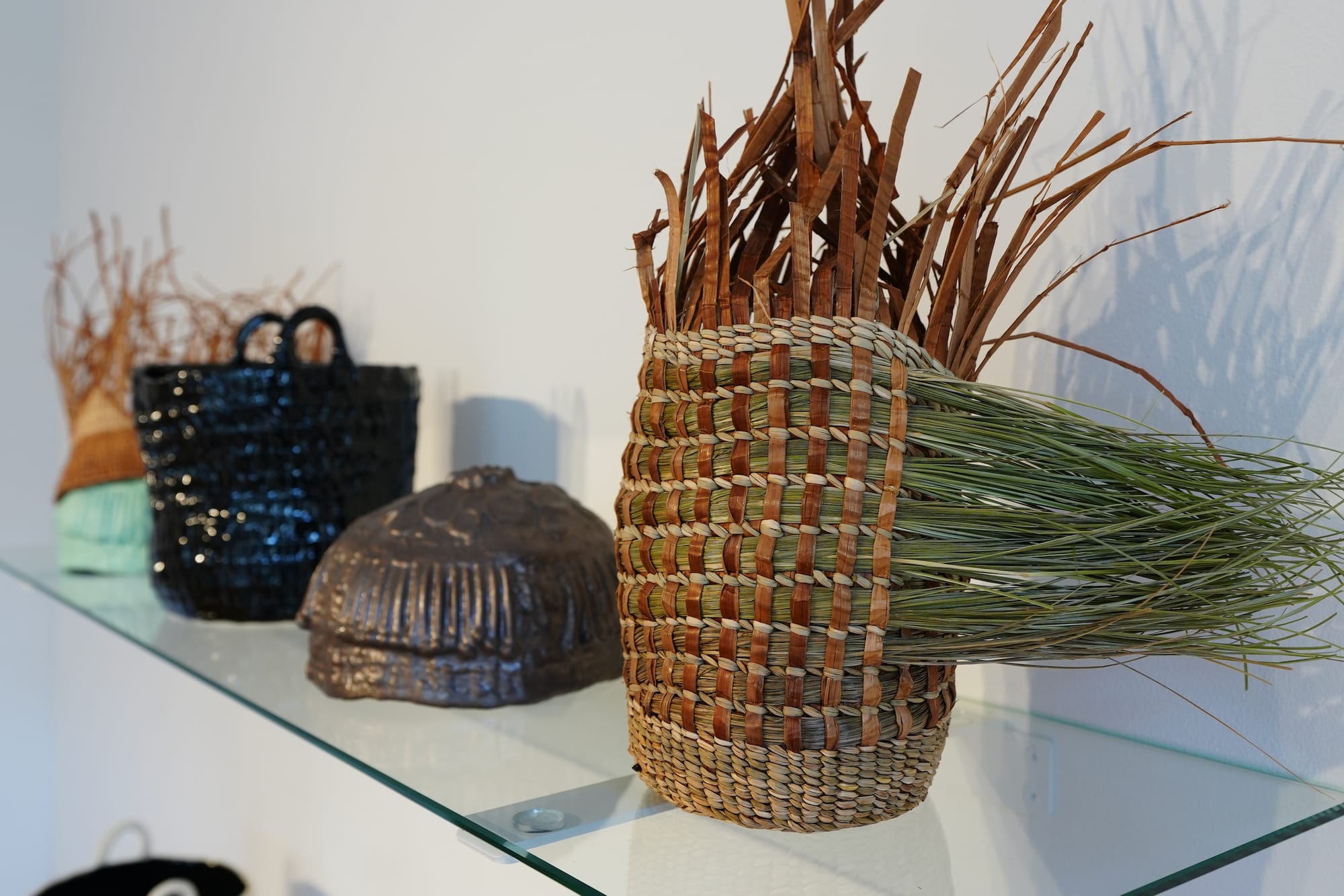 In “skyline” (2024), seven glazed slip cast ceramic baskets are placed in front of the windows, making us aware of the pattern of urban structures across the street from the gallery, which denote another type of rhythm in stacked forms. The three large paintings here are more austere than previous panel works, using graphite, acrylic, Xerox transfer, and other techniques that reclaim cultural forms that went into “hibernation,” a term she’s used before, during the 1850s, when her own tribe was dispossessed and persecuted by the US government almost to the point of complete genocide. Each of these art pieces, particularly the baskets and dance caps, renew the promise that art has an alchemical power that can be born from humble yet proud origins, and with the right care it can be woven into gold. —HV