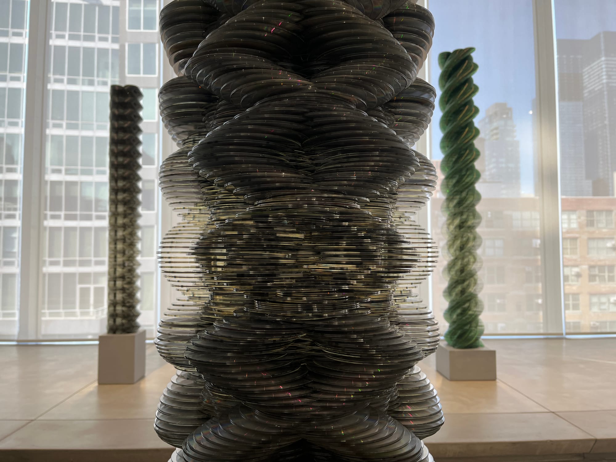 I hesitate to confess this, but the first CD I purchased was Bon Jovi's album Keep the Faith in the mid-1990s. I'd like to believe my musical taste has improved dramatically since then. Memories of this teenage lapse in judgment resurfaced as I stood in front of Tara Donovan's sculptures, made entirely of found CDs. Called "stratagems," these technological relics are upcycled into columns that sit atop concrete pedestals, refracting light from the gallery windows in such a way that creates an optical illusion of movement.