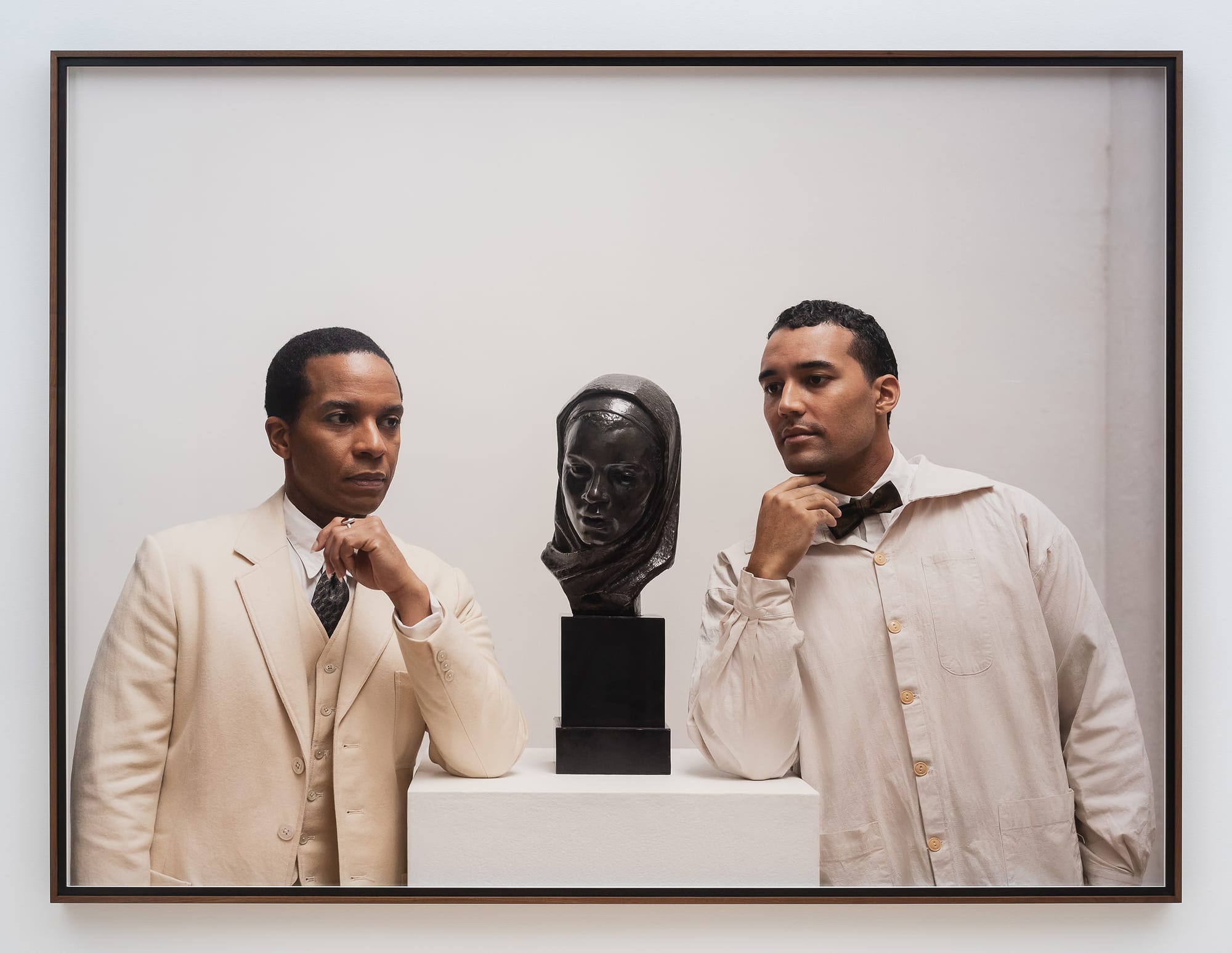 The atmospheric tableaus made for this exhibition celebrate the 1930s Harlem Renaissance and are inspired by the historical relationship and love story between Alain LeRoy Locke, philosopher and cultural critic who is known as the “Father of the Harlem Renaissance,” and Richmond Barthé, a sculptor known for his portrayal of Black subjects. Images of Locke and Barthé (played by actors André Holland and Alex Part) suggest a form of political resistance through the possibility of desire between two Black men. Thinking about the exhibition title, Once Again … (Statues Never Die), we can at least hope that monuments may be re-imagined towards the narration of a better future.