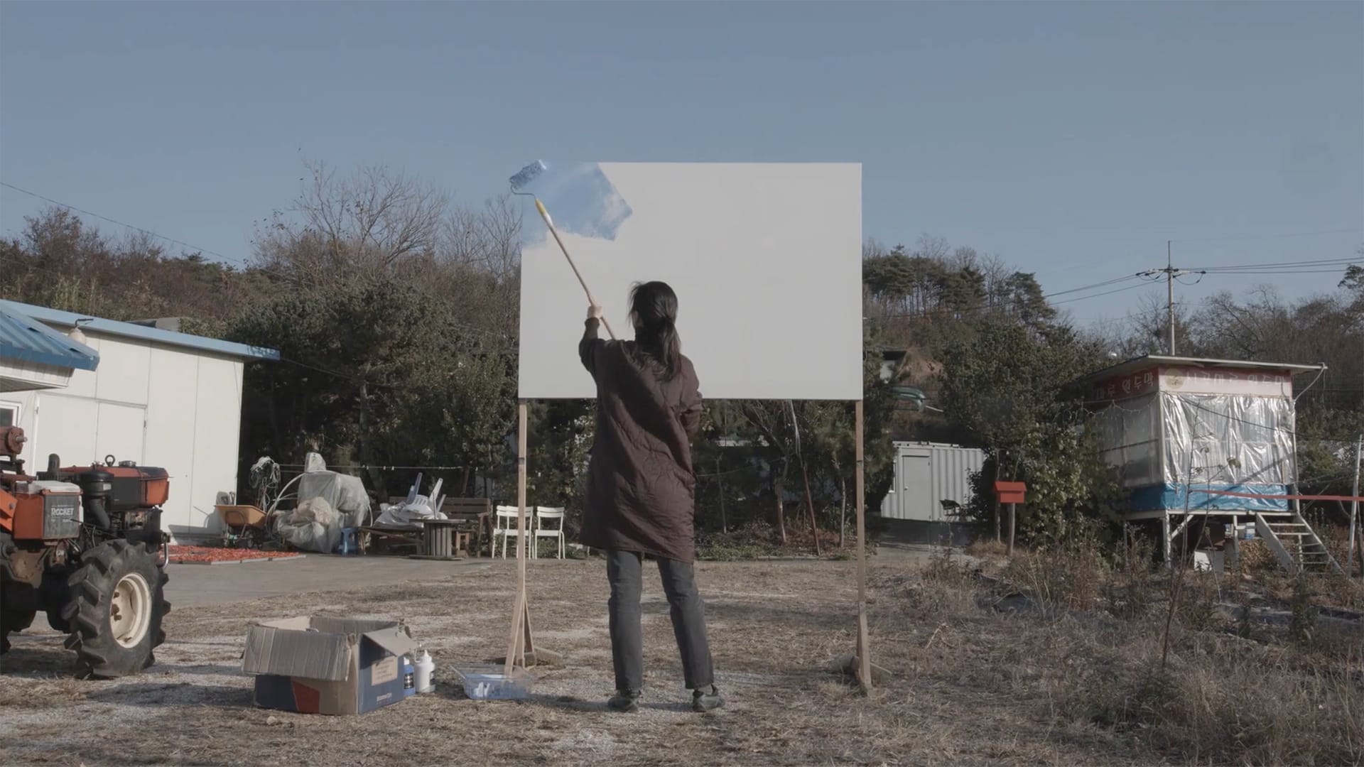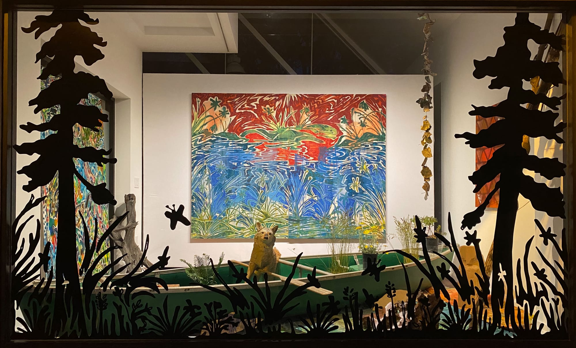 In the gallery’s exhibition window vitrine, facing the street and the neighboring community, Azzuz and Lulu Thrower created a narrative diorama entitled trickster returns (2023), which includes a repurposed family canoe and a new painting by Azzuz, “Coyote Tales” (2023), based on a traditional Karuk tale.