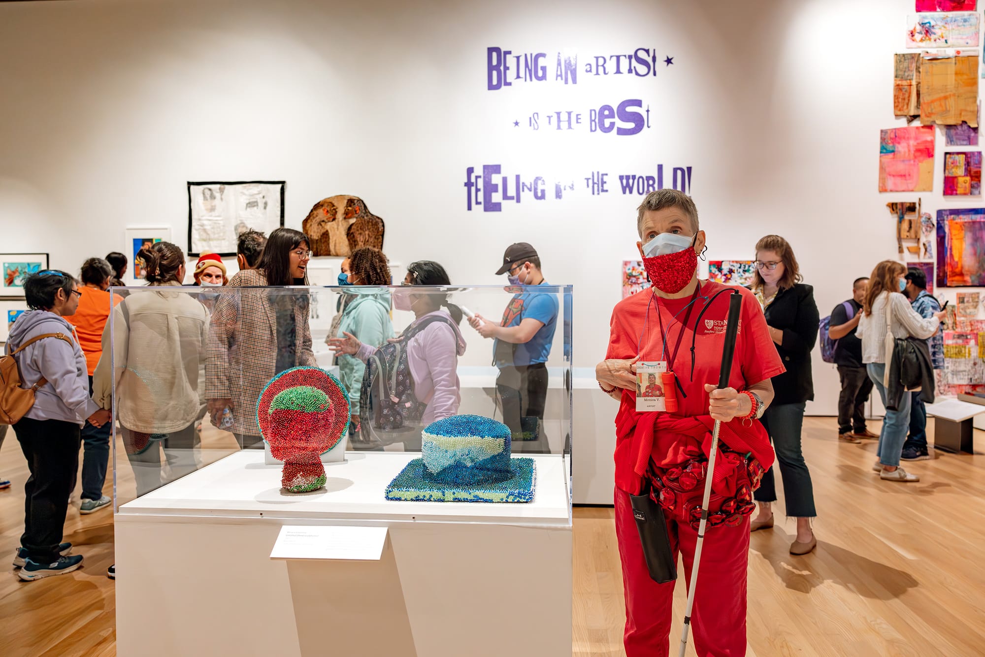 Bringing together 300 artists and 600 works from these three profound venues, Into the Brightness is a celebration of creativity. Beginning with "Welcome"(2023), a video showing artists happily greeting the audience, what follows are large gallery spaces filled with vivid joyful artworks, ephemera, and videos. Included are Monica Valentine’s intricately sequined sculptures, Samedi Djeimguero’s sculpture “Thank you for helping me” (2021) from his residency at Recology in San Francisco, Jonathan Velasquez's large-scale cardboard musical instruments, Jason Powell-Smith’s text-based works, narrative works by Rosena Finister with her signature speech bubbles, a fiber sculpture by Joseph Omolayole, and two collaborative murals — one organized by the Creativity Explored studio, the other by NIAD Art Center.