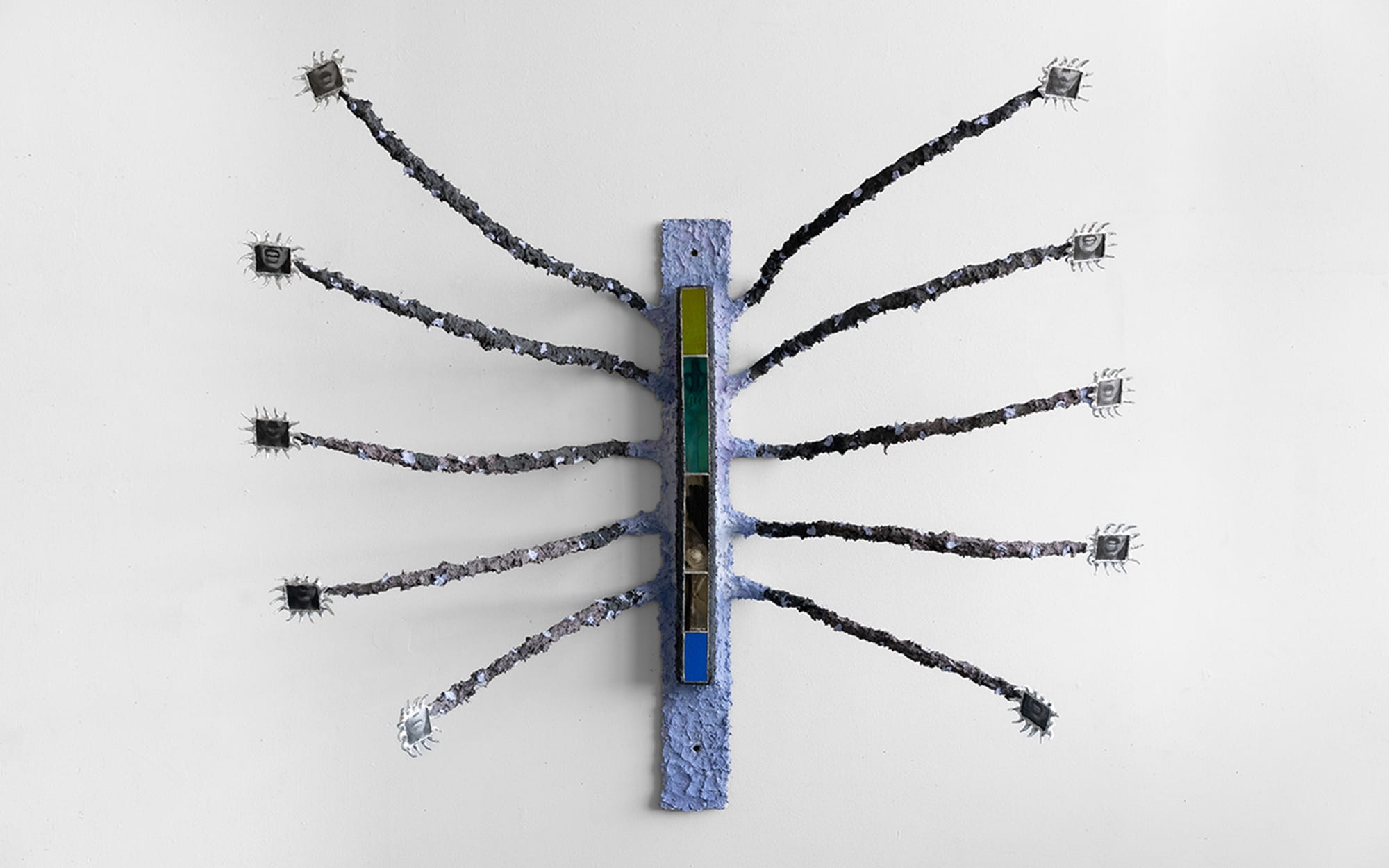 For her show at Micki Meng Gallery in downtown San Francisco, Puerta continues her deep research into what she calls “world-making, shape-shifting, border crossing, the natural, and the alien and language failure.” The wall works featured in Tragada play with the ideas of slippage and transformation in areas of the body, such as the throat, where speech happens. A work titled “Like a thorn piercing through a tough skin that doesn’t know if it is open or broken” (2023) is made from materials: steel, plaster pulp, acrylic, stained glass, mixed organic media, photographs, and aluminum leaf. It reads as a decorative organic ornamental object that is attached to the wall but extends well beyond it.