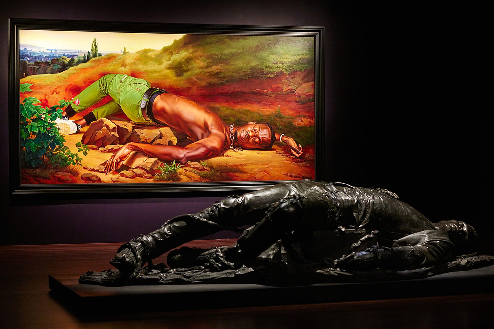 Horizontal Black figures dominate this exhibition. Billboard-sized paintings of beings struck down, wounded, or dead suggest martyrs and the legacies of colonialism and systemic racism. Large-scale or small-scale sculptural figures (never life-size) are prone in the grass or a tomb while others appear doubled over in anguish, drawing a violent and visceral connection to the larger systemic racism and the individual. An awe-inspiring central bronze equestrian monument, which stands on a plinth at nearly 20 feet tall and weighs several tons, is isolated in a dramatically lit burgundy room. A shirtless young Black man with cornrows is slumped over a horse’s back like a fallen warrior, while his legs, adorned with Nikes, dangle below. Although the de Young Museum has thoughtfully established a “respite room” for viewers triggered by visions of Black trauma, this gallery seems to offer viewers a chance to naturally pause, contemplate, and mourn in the darkness.