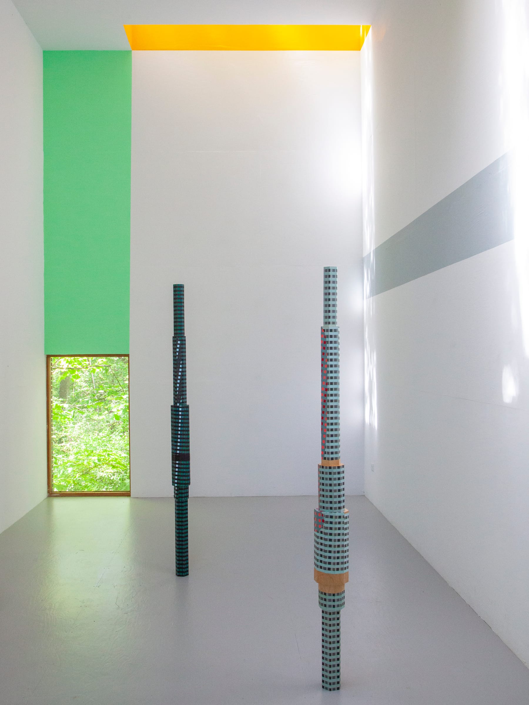 ‘T’ Space in Rhinebeck aims to foster and amplify collaboration among artists via the interdisciplinary cross-pollination of art, architecture, music, poetry, and ecology. Curator Susan Wides does just that with PAINTING / SCULPTURE, which pairs paintings by seasoned artist Peter Halley and sculptural works by emerging artist Steph Gonzalez-Turner. During the 1980s, Halley became known for a bold, geometric abstraction that set the stage for a new take on minimalism. In recent years, his work has focused on multi-media, site-specific installations such as the works created for this presentation, including hazy wall paintings consisting of latex and fluorescent acrylic paint. Gonzalez-Turner’s crowd of skinny, sophisticated sculptures between around three and seven feet tall are both figurative and architectural, contrasting with the lush colors of Halley’s ethereal works. The energy between Halley’s paintings and Gonzalez-Turner’s sculptures celebrates both their collaboration and the unique mission of ‘T’ Space.