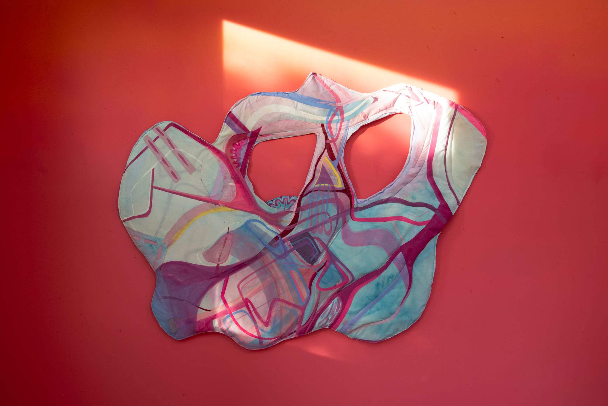 I was first introduced to Pam Poquette’s organic style when I was part of a jury for a call for artists, and I was immediately captured by her joyfully expressionistic cosmic realms. Curated by Owen Barensfeld, the self-styled caretaker of the Green Lodge in Chatham, this solo exhibition is a cheerful site-specific installation of Poquette's latest fluorescent fiber work, including hanging sculpture and fabric pieces that cavort carefreely around the walls. The “whimsical picnic” of her visual style, as the press release puts it, evokes a female-coded nostalgia in their vibrant color. Paintings such as “pink sunrise” (2024) and “tender mask” (2024) flow in abstract, graphically gorgeous gestures. A series of small sculptures that recall stuffed pillows are a sweet and silly footnote to the exhibition: Technicolor embroidery works including “consolation” (2023) and “spark” (2024) are domestic and sensual at once, and a small sculpture made of acrylic and flashe on stuffed fabric titled “little comforts” (2023) all but begs to be cuddled.
