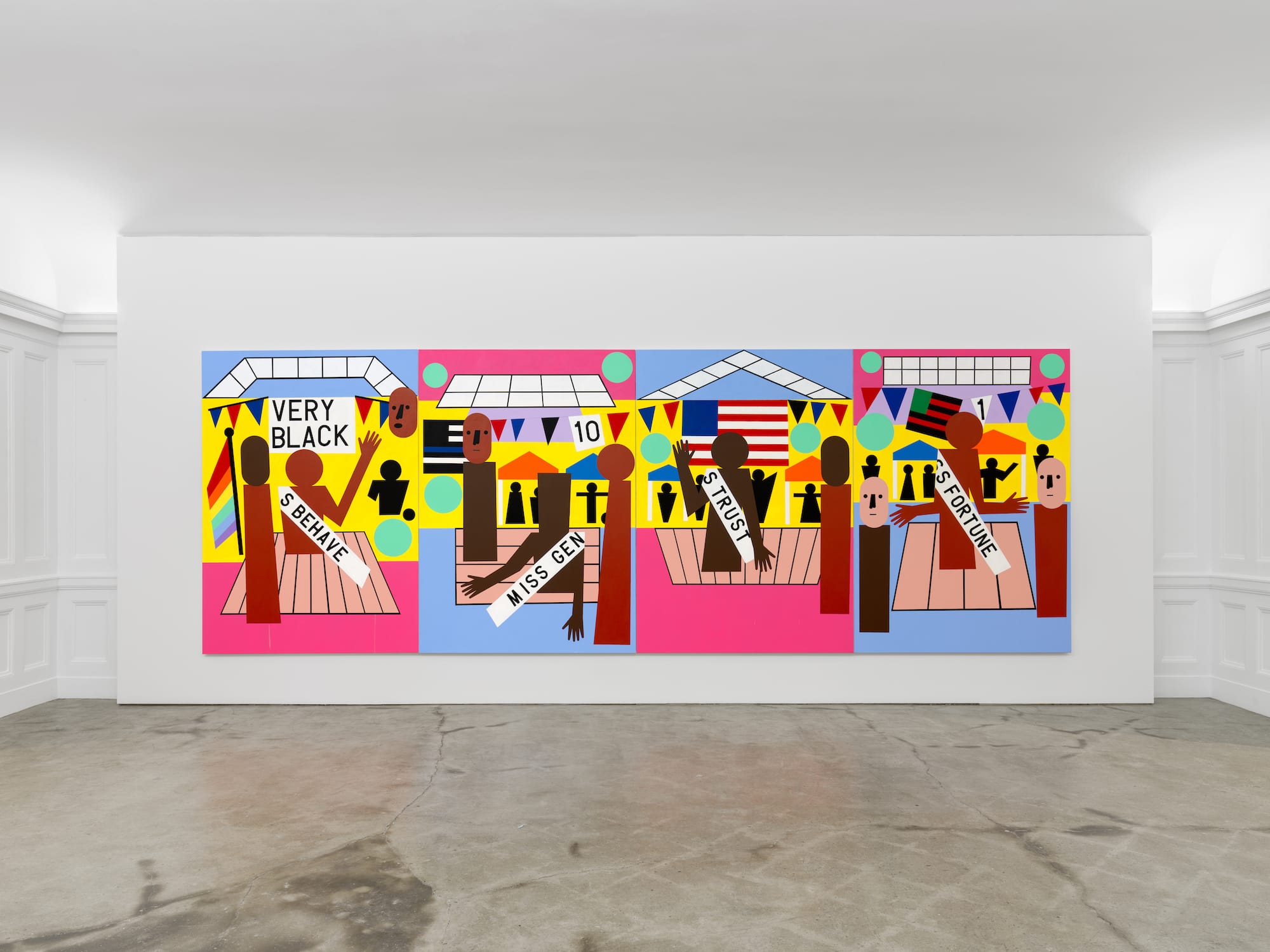 As we honor Faith Ringgold and the pioneering contributions of her generation, a new cohort of powerhouse women artists is redefining Blackness and Black culture. Among this group is Nina Chanel Abney, a wise-cracking artist who tackles thorny issues surrounding race, homophobia, colonial attitudes, and systemic inequality through her bold, bright, multi-media artworks. Her blockbuster solo show at Jack Shainman Gallery’s the School in Kinderhook packs a punch with a dynamic series of Cubist-inspired collages, site-specific murals, digital art installations, NFTs, prints, and sculpture. Several of Abney’s paintings surface the race-related structures that underpin familiar situations, such as “Miss Opportunity” (2024), which features Black figures without true facial features at a beauty pageant below a banner that reads “VERY BLACK,” while white figures gawk at the spectacle. As a whole, she invites the audience to consider the racial injustices that mar this country and others.