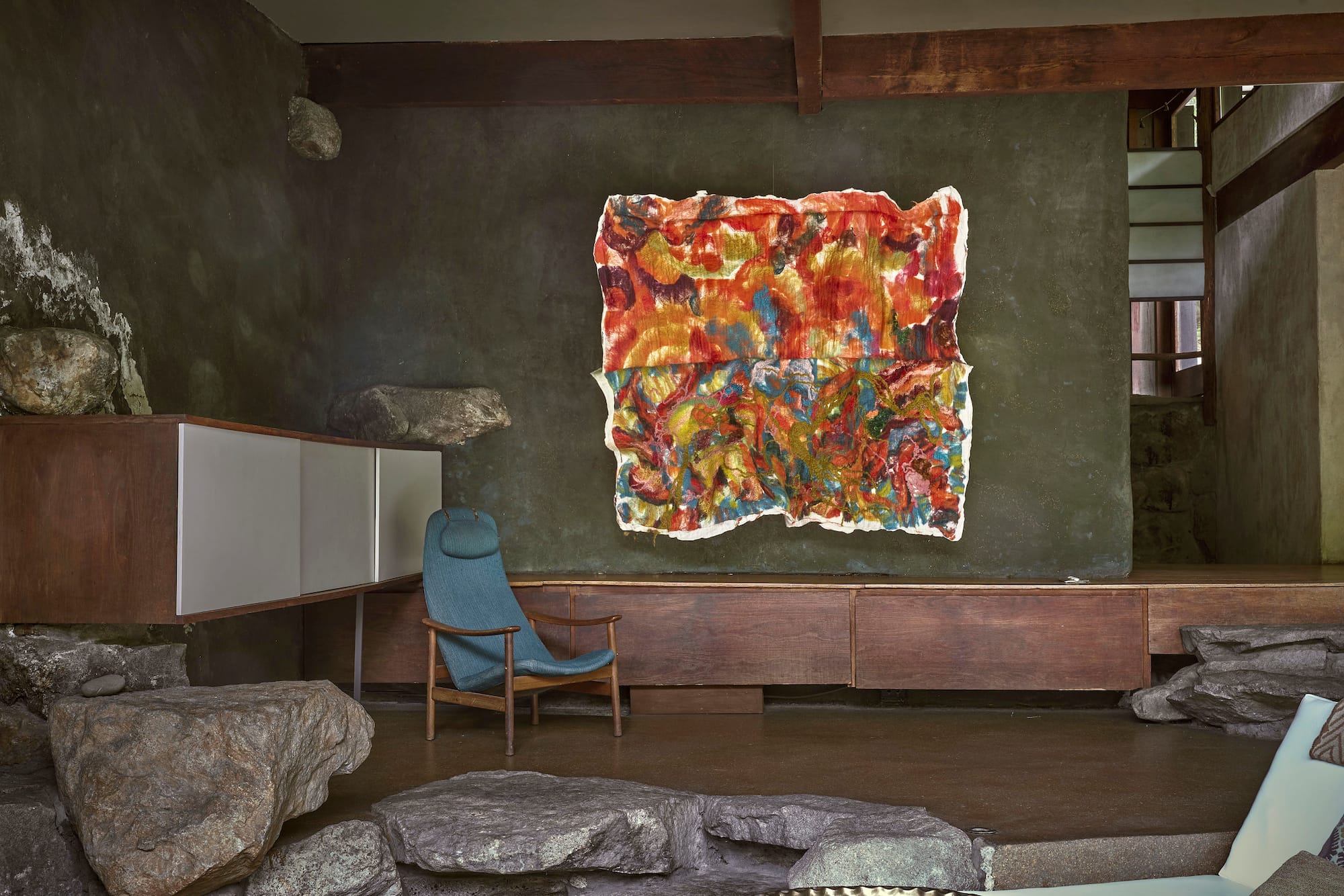 Among the hidden treasures in Upstate New York is Manitoga in Garrison, the former home and estate of the late American industrial designer Russel Wright, who died in 1976. Known as “Dragon Rock,” the estate is a National Historic Landmark and one of the few 20th-century Modernist homes in the United States open to the public. This month, The Source of Everything, a group show of multi-media works by seven artists who share a reverence for nature curated by Kate Orne, founder of Upstate Diary and former editor at Interview magazine, is installed on Manitoga’s walls. A series of luscious ceramic glazeware works by Jeremy Anderson includes the curiously rippling “Piccolo 147” (2024), while Sagarika Sundaram’s bright textile mural “Sight Unseen” (2024) enlivens the grayscale room where it hangs. Myra Mimlitsch-Gray’s calm, wave-like bronze sculpture “Hewn” (2019) and Lola Montes’s hand-carved and -painted ceramic piece “Artichoke Candleholder” (2023) in particular harmonize with the Modernist simplicity of Dragon Rock.