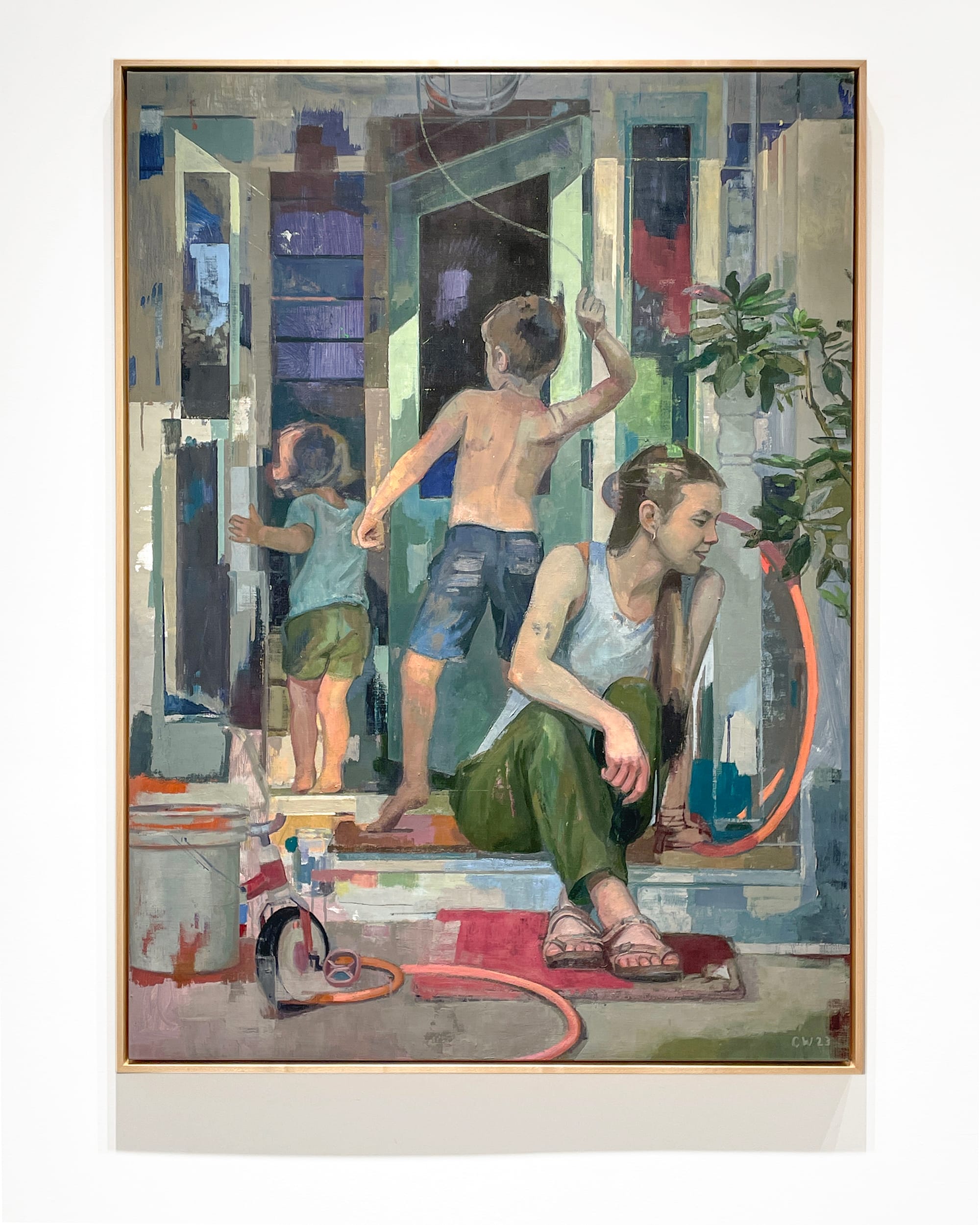 The human figure has been an indispensable subject from the beginning of the art historical timeline, yet distinct reconfigurations of its form still abound. All Figured Out at Carrie Haddad Gallery in Hudson brings together the work of seven painters who are refiguring the body. Among the bright and hopeful works in this show are ransome’s acrylic and collage paintings on canvas and panel such as “Gee’s Bend Quilter Alice Jean” (2023), in which a graceful woman in a yellow dress is surrounded by colorful quilted fabrics in a shining vision of youth. Some of the figures seen in this show invite us into their world, such as the children on a porch in summertime in Caitlin Winner’s “Straw House” (2023), whereas other works, such as the lone, red-caped figure under a radiant moon in Carl Grauer’s “Nightmoon” (2024), invite curiosity. The show is rounded out by Robert Goldstrom’s paintings of muscular male bodies, including “Anatomy Lesson No. 76” (2024), and Lauren Hamilton’s portraits of couples in period costumes, such as “1720 (Matrimony Series)” (2023).