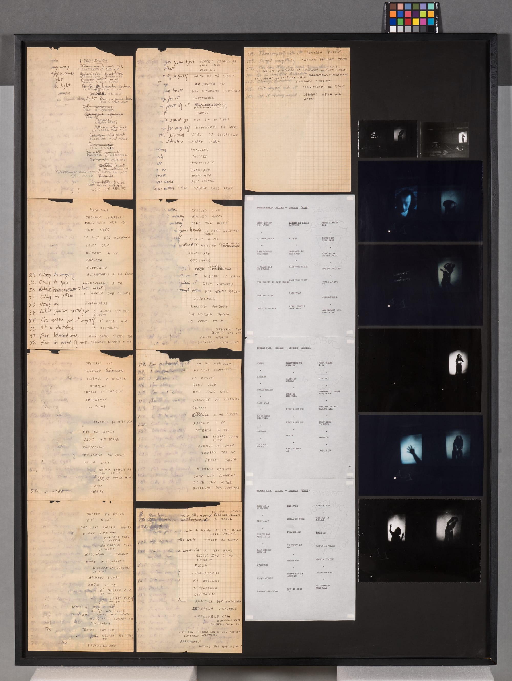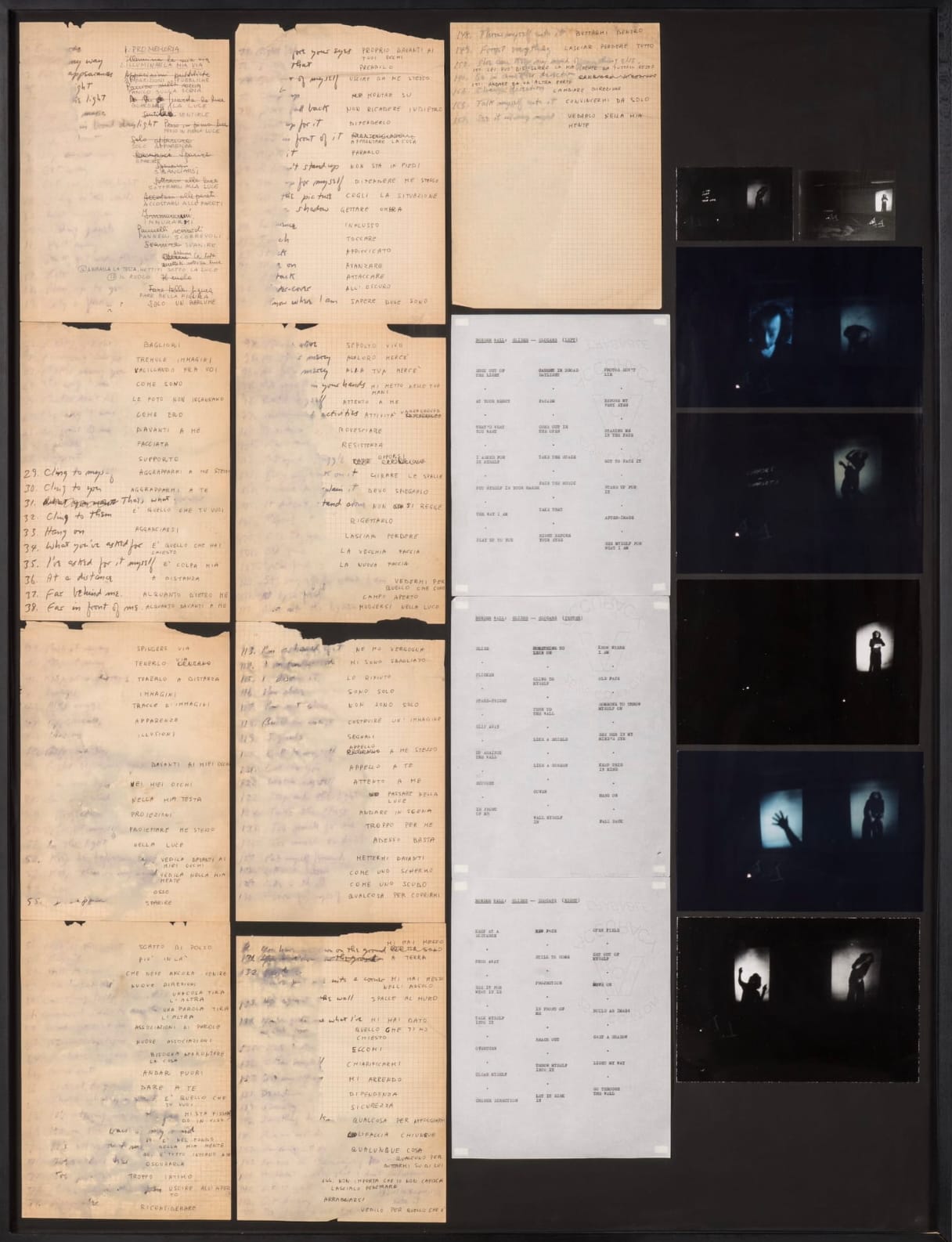 Among the most unforgettable moments from art school was learning about Vito Acconci’s masturbatory performance “Seedbed” (1972). The Loeb at Vassar College’s exhibition on the artist features archival materials, personal notes, scripts, photographs, and an audio recording that document a performance in Rome in 1973. This archival installation includes framed layers of aging pages full of Acconci’s poetic handwritten notes (some in Italian) and his typed-up subversive commentary on the Vietnam War, where isolated phrases such as “BEFORE MY EVERY EYES” and “STAND UP FOR IT” reflect Acconci’s bravery as a leading conceptual artist of his generation.
