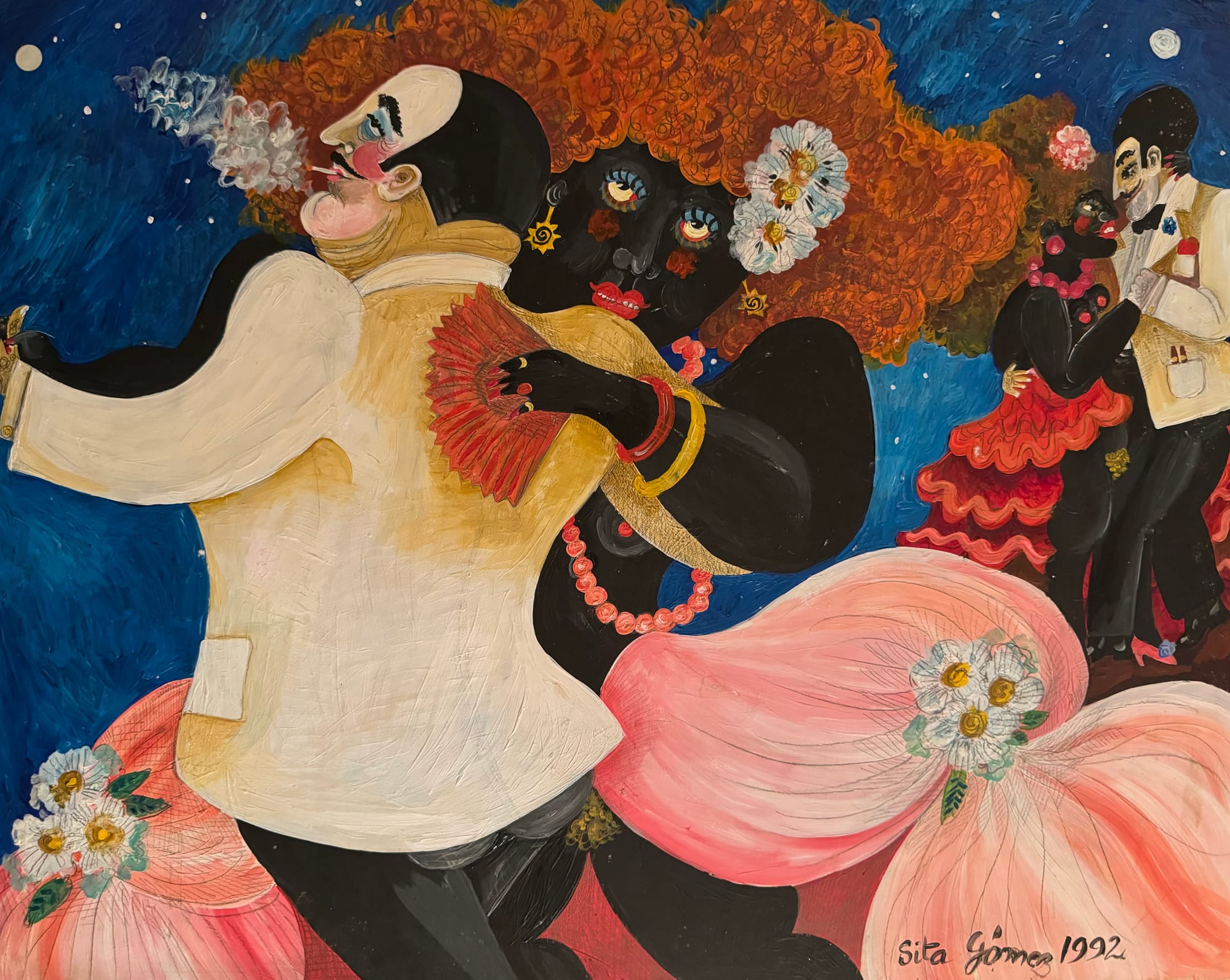 Born in 1932 in Paris and raised between Europe, Cuba, and the United States, Sita Gómez is a living legend. Bringing together a robust body of work created during her 75-year career, Sita Gómez: A Retrospective at Hudson Hall, curated by Nancy Cobean of Rose Gallery, is a celebration of women, culture, and love. Each work welcomes us into Gómez’s lush vision of joyous women ruling their private worlds. In “The Collector” (1999), a smiley gal in vintage lingerie and red heels admires several artworks on the wall as she relaxes on a white puffy couch. “Black Mantilla” (1971) is a portrait of a lovely topless lady in an overflowing shawl — a sumptuous modern take on Goya’s famous painting “The Black Duchess” (1797). “Baile Tropical” (1992) is a quintessential image of women living their best lives; it features two mixed-race couples holding each other close as they dance passionately into the night, the women’s whirling skirts revealing their carefree bareness below.
