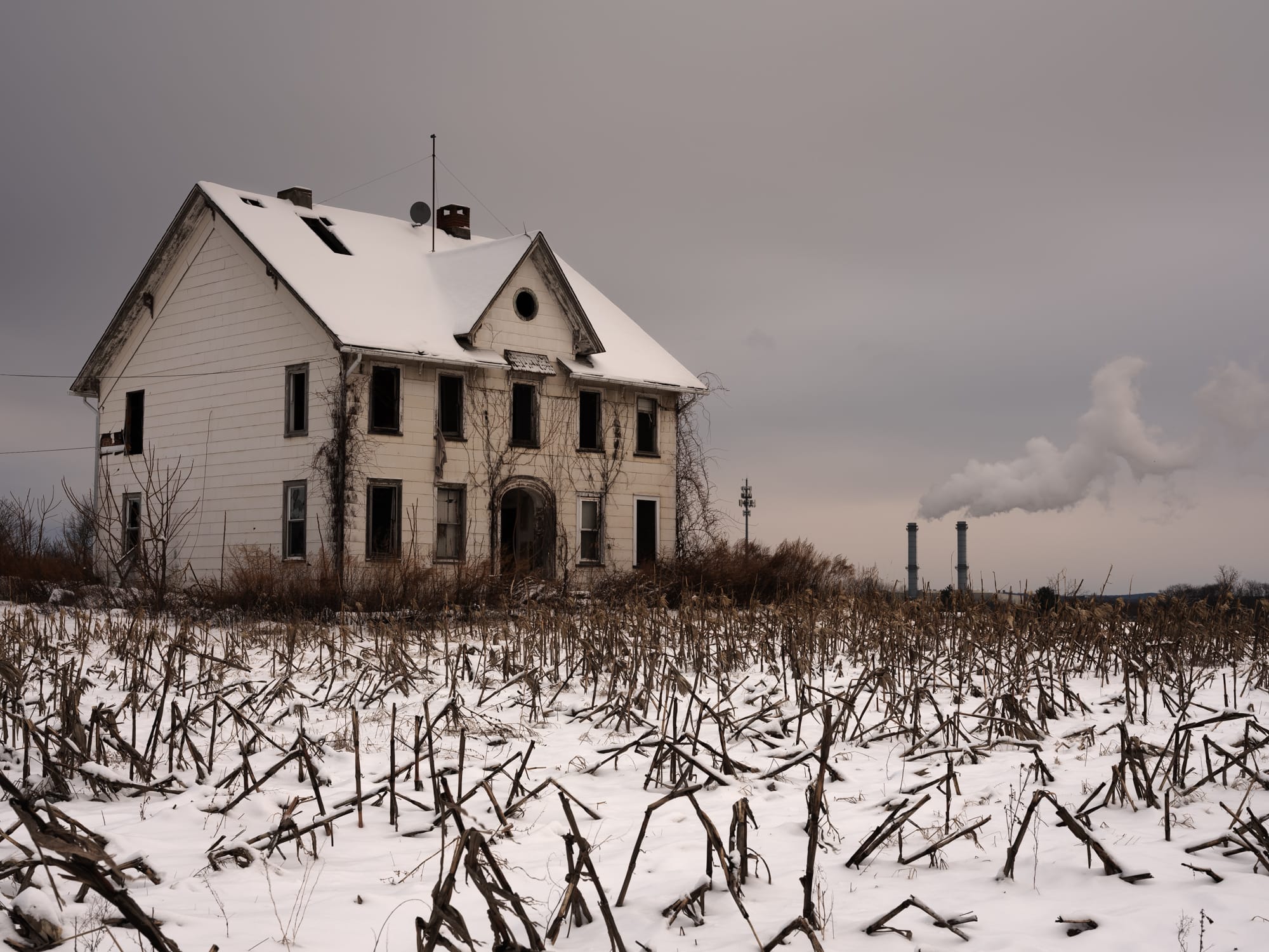 Constant distraction is a hallmark of our digital era, but Michael Salomon redirects our attention to patient observation and the power of place. His solo show Familiar Terrain at Delaware Valley Arts Alliance features a series of arresting photographs that reflect a sense of both isolation and possibility. The eerie nighttime glow of a roadside diner in “Restop, Parksville NY (12/28/24)” (all works 2024) looks like the opening scene of a thriller movie, while the desolate vision of a hotel in “Vacancy, Liberty NY (5/28/24)” could be the backdrop for another scene in the same film. “Smokestacks, Middletown NY (12/21/24)” is a rugged image of an abandoned white house set against a winter sky, its snowy yard filled with collapsed branches, while “St. Mary’s Catholic Church, Port Jervis NY (9/13/24)” is a sober memento mori: white crosses hang on a wire fence in front of suburban houses.
