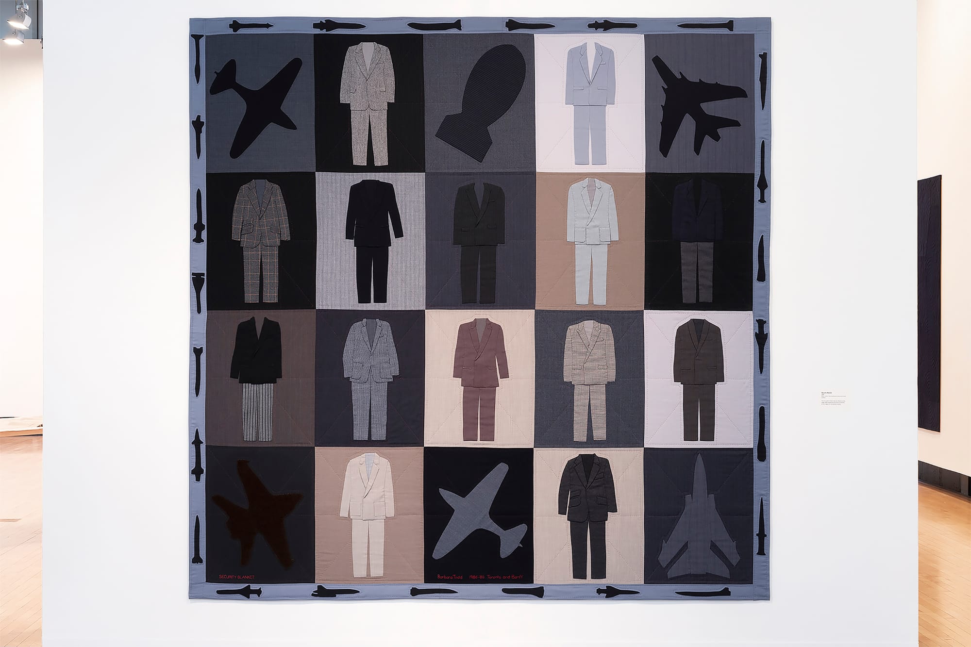 Exploring the dynamic intersection between history, politics, materiality, and minimalism, seasoned Canadian textile artist Barbara Todd employs fabric as both muse and messenger. Undoings at Opalka Gallery, her first major regional solo show, showcases Todd’s devoted use of wool — her primary medium for over 40 years — to reinterpret stories from the past and identify issues of the present. In “Security Blanket” (1988), neat rows of men’s suits in grayscale colors are tucked into uniform-sized squares that feature fighter jets at the corners and border and one stout missile at the top, while “Overkill” (1992) is a barrage of black and gray missiles barreling down against a brown backdrop. “Dark Coffin Quilt” (1993) is a chilling vision of little fabric caskets in patterned rows, and “Speed of Darkness” (1997), with its two stoic skyscraper-like structures, is an uncanny homage to the fallen Twin Towers in Manhattan.