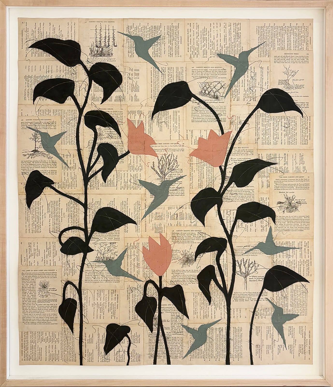 It seems that I encounter artistic magic every time I visit Carrie Haddad Gallery. Featuring mixed-media drawings by 10 artists, The Drawing Show is eclectic and curious. David Soman’s “Cordwood II” (all works 2025) is an exquisite hyperrealist charcoal drawing of rounded wood resting in a pile, while Louise Laplante’s “Garden Making and Keeping” is a graceful vision of silhouetted floral stalks and happy hummingbirds on vintage book pages. “Magritte on Buffalo Island” by Glenn Palmer-Smith is a lively scene of the surrealist painter René Magritte standing on the back of the submerged titular animal, as swimmers dive and float about. Kathryn Freeman’s “The Ruby Slipper” is yet another dreamy moment in this dreamy show: A bird arrives through a window to deliver a red slipper to a resting woman, her loyal canine nearby.